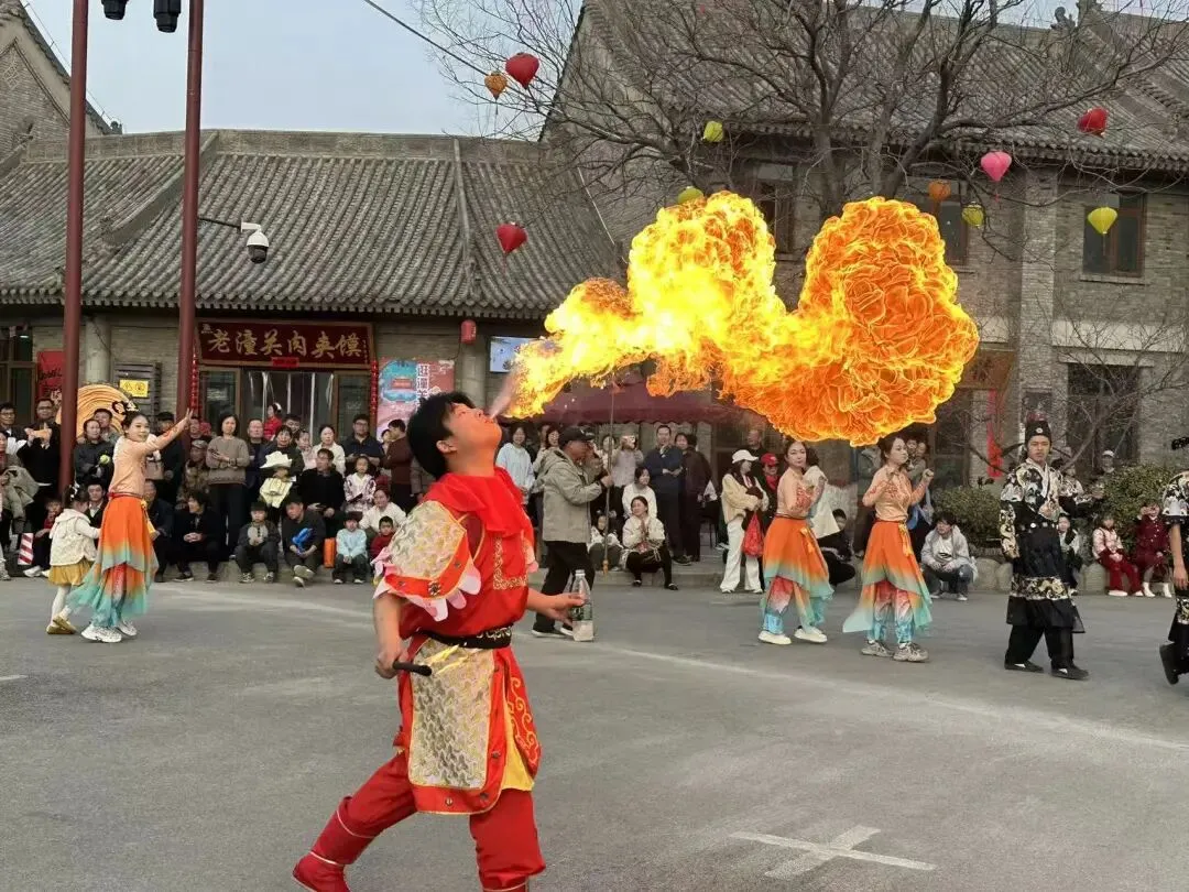 走进潼关古城,红灯笼早已挂满街巷,元宵元素点缀在青砖黛瓦间。清晨的古城弥漫着烟火气,午后的表演区挤满期待的游客,夜晚的钟楼篝火映红每个人的笑脸 —— 从 9:00 到 21:00,不同时段的古城有不同的韵味,等待您来探索。
