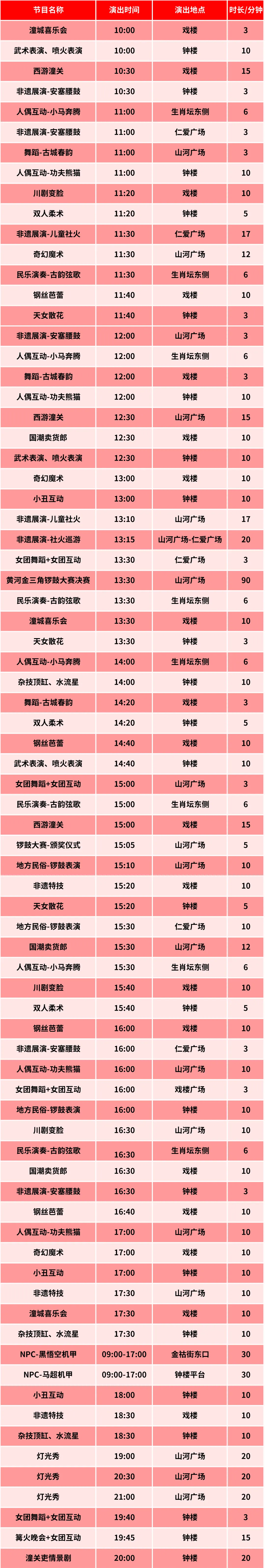 开阔的山河广场适合观赏大型表演,17 场演出从上午 11 点持续到晚上 9 点,满足不同时段的游玩需求。