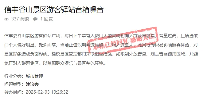 经调查核实,您反映的情况属实。近期,在谷山景区游客驿站广场,确有少数游客或市民在下午时段使用音响设备进行歌唱活动,其音量较大,且播放内容相对单一,对景区内其他游客的游览体验造成了一定干扰。时值假期客流高峰,此类行为确有可能影响景区整体环境和公共秩序。
