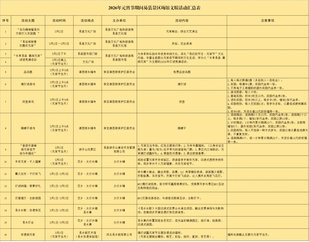 2026年元宵节易县景区场馆文娱活动一览表