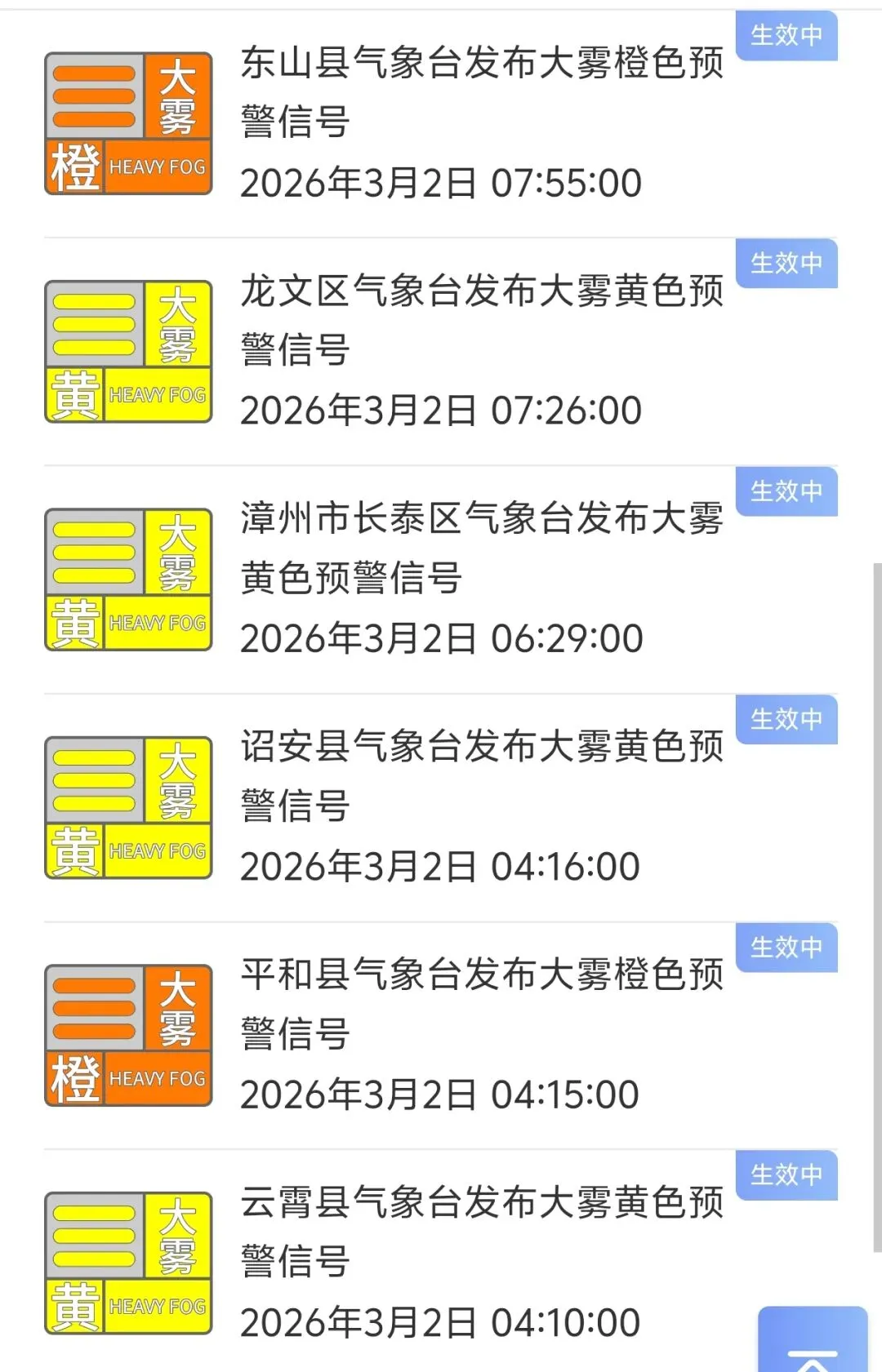 漳州多地发布大雾预警