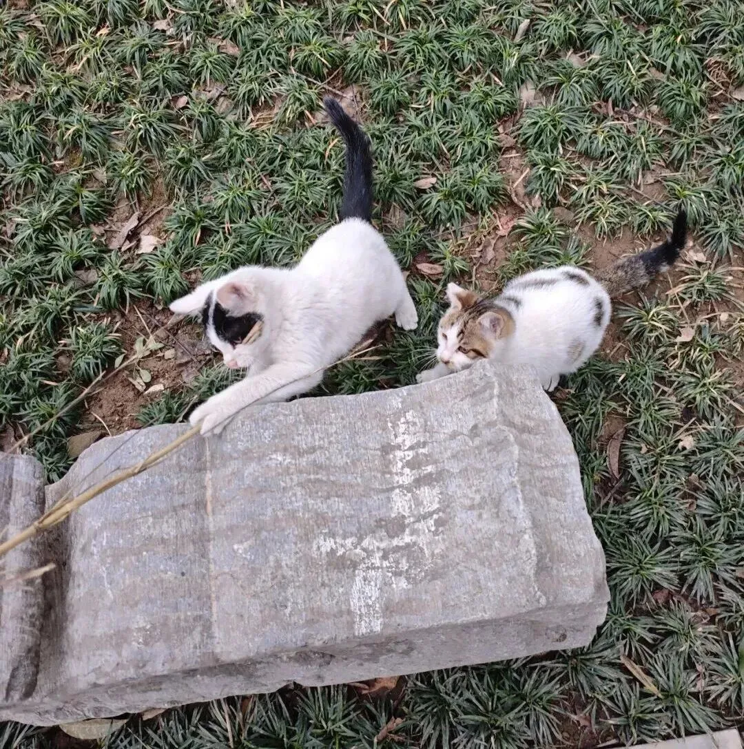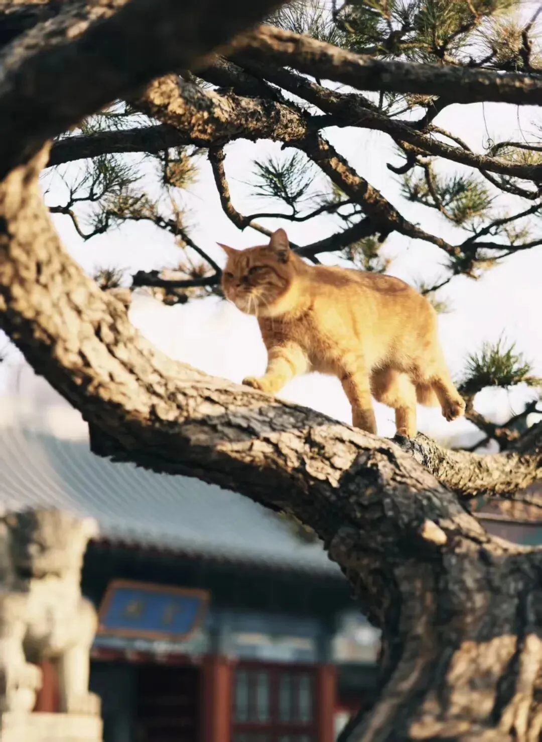 清晨,它们卧在石阶上晒太阳,把自己揉成一团毛茸茸的云;午后,它们漫步在古柏林深处,脚步轻得像一片落叶;傍晚,它们蹲在屋檐边,看游人来来往往,眼神安静又疏离。你走你的路,它过它的桥,互不打扰,却又温柔相遇。