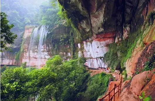 十丈洞瀑布,高七十多米,宽八十多米,从丹霞崖壁上跌下来,水雾漫天。佛光岩,一面巨大的丹霞崖壁,弧形,像佛光。水从崖顶流下来,细得像丝,飘飘洒洒。