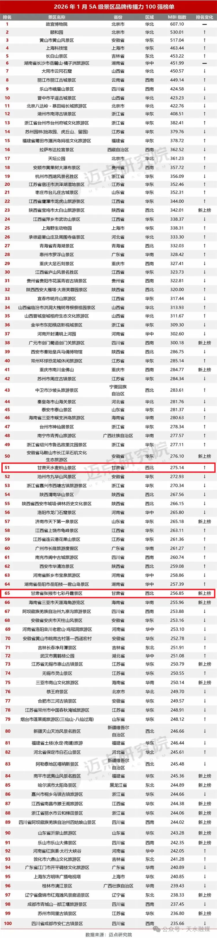 近日,迈点研究院公布“2026年1月5A级景区品牌传播力100强榜单”,甘肃两家5A级景区入选。其中,天水麦积山景区位列百强榜第51位,在细分类型榜单中荣膺“综合吸引类”第一,张掖七彩丹霞景区位居百强榜第65位。在西北地区榜单中,两景区分列第6和第10位。