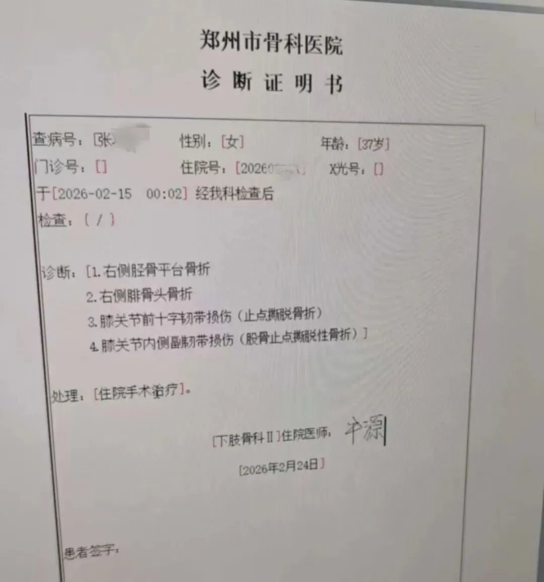 2月28日下午,记者联系到受伤的张女士时,她仍在郑州市骨科医院接受住院治疗。