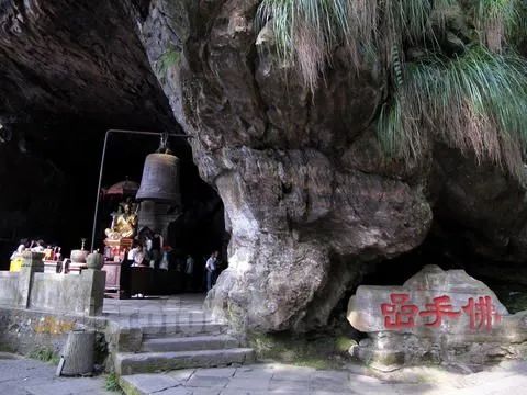 【三宝树】此处浓荫蔽日,绿浪连天,这三棵参天古树凌空耸立,其中二棵是柳杉,各高40余米,其余一棵为银杏,高约30米,主干数人合抱不拢,形同宝塔。据树下巨岩上所刻“婆罗宝树,僧昙诜手杆"十字来看,已有一千六百多年。