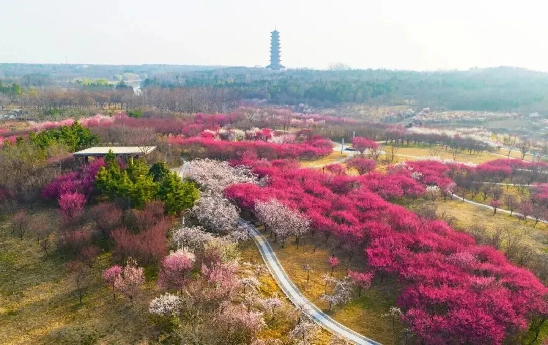 三台山国家森林公园中梅花正盛,红梅似火、白梅胜雪,樱花也开始绽放。