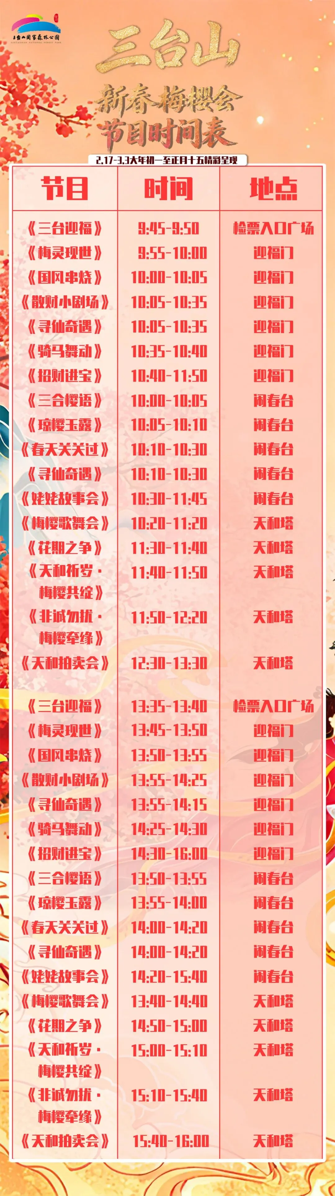 “新春梅樱会”一直持续到元宵节。从西主入口进入景区,一路有迎福歌舞、情景演艺、点茶品鉴、故事会、古风游戏,你可以在花间参与趣味互动,集“寻芳令”兑换好礼,在梅樱交织的春色里,把好运带回家。