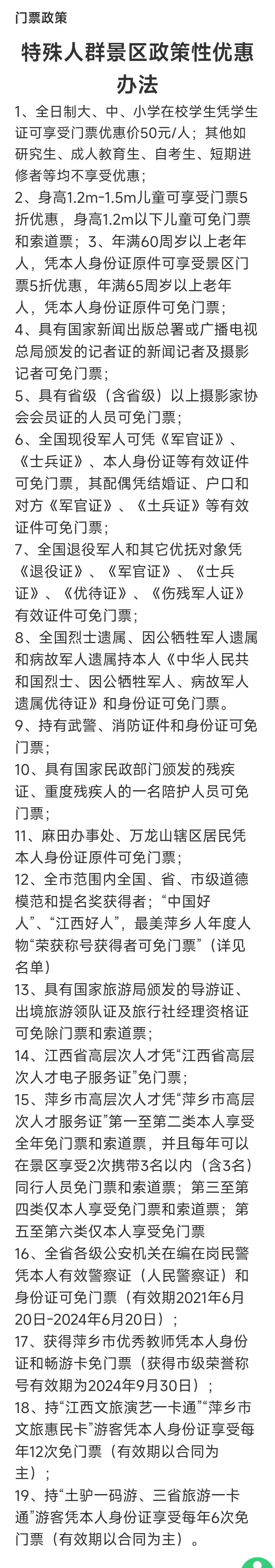 武功山门票优惠政策: