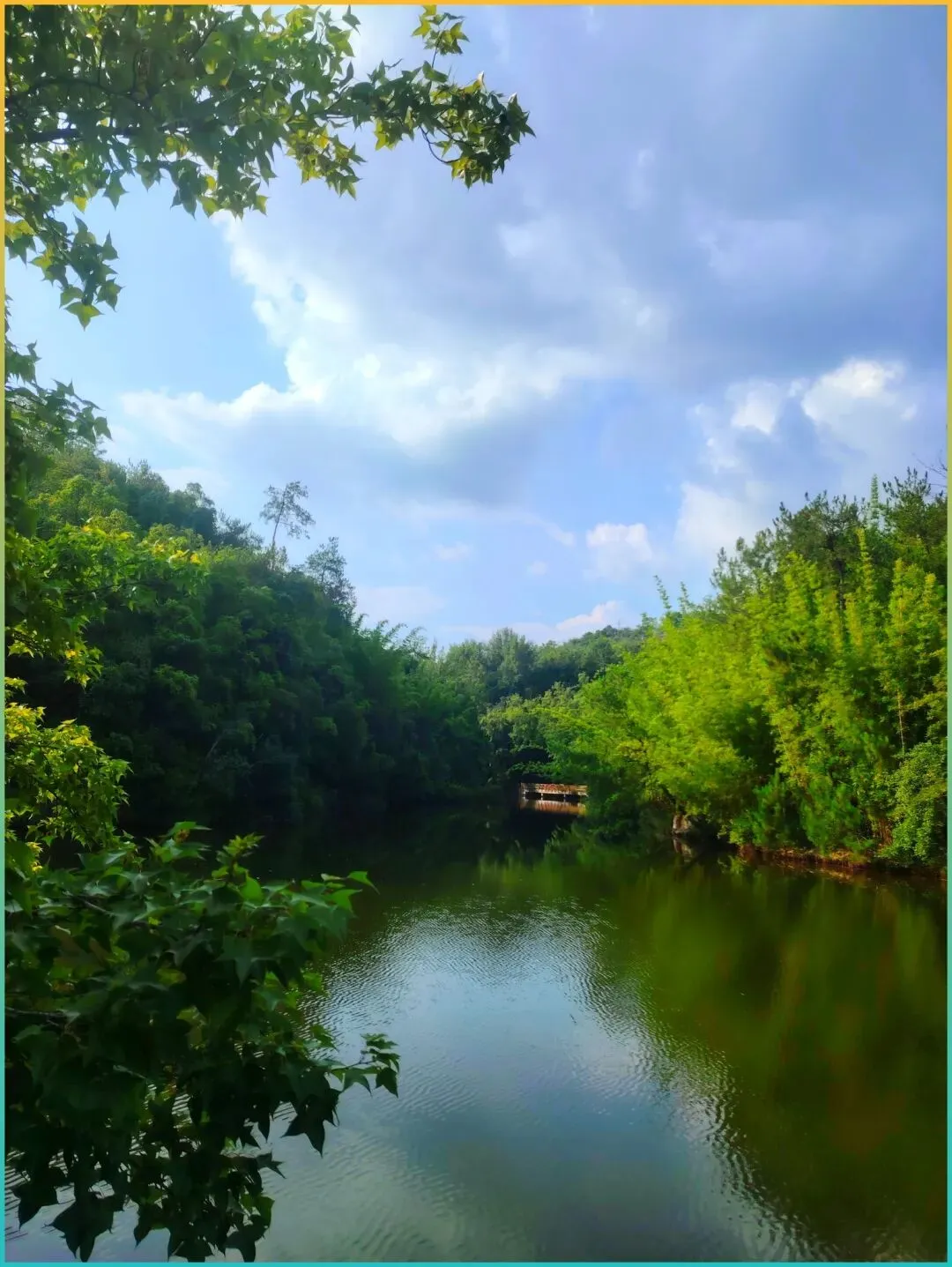 这里还有一条小溪穿过谷底,倒影把天空和花树融合在一起,拍照没滤镜都能出画报感。