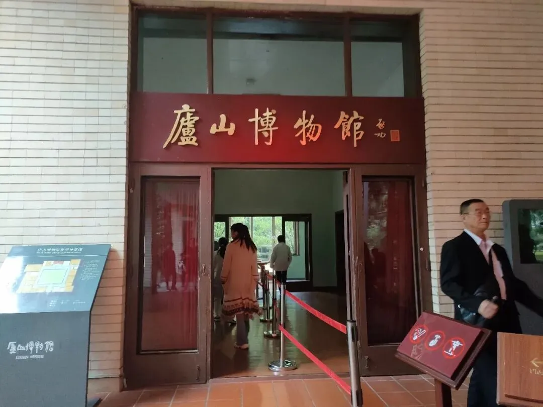 从庐山抗战博物馆出来,沿着一条两边是古木参天的大道而行,来到了庐山博物馆前。只见入口由一左一右的两个石墩组成,两面石墙从两边的石墩延伸开去。左边的石墩上挂着“庐山博物馆”,右边挂着“毛泽东旧居”(下面还有一行小字“芦林一号”),两块牌子都是红底金字。