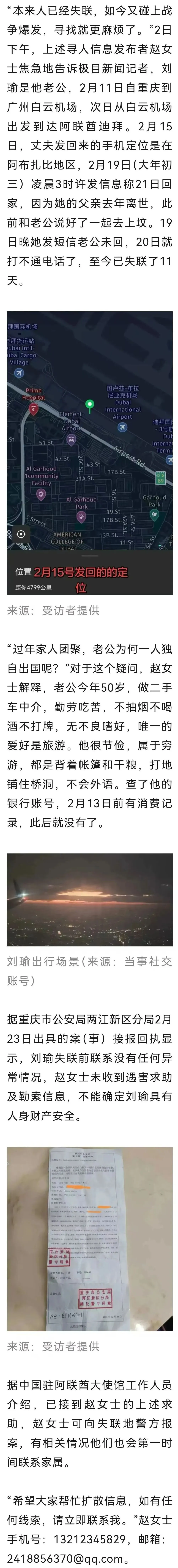 您现在的位置是:首页 > 国内旅游目的推荐 > 正文 国内旅游目的推荐 男子阿联酋旅游失联11天又逢战乱,“谁能帮帮我?”妻子急寻:他是穷游,背着帐篷和干粮,不会外语 admin2026年03月03日 07:51:03国内旅游目的推荐1 男子阿联酋旅游失联11天又逢战乱,“谁能帮帮我?”妻子急寻:他是穷游,背着帐篷和干粮,不会外语3月2日,有网友发视频称:刘瑜阿联酋旅游失联,谁能帮帮我?寻人信息显示,此人性别男,身高1.65米,体重约160斤,可能穿着:黑色皮衣、皮鞋与青蓝色相间双肩包;可能区域:阿联酋(特别是迪拜、阿布扎比)及相关航班。来源:当事人社交账号往期推荐01挑动性别对立制造婚育焦虑!知名女演员被禁言!02刚刚,日本突发地震!03大反转!确认系摆拍,多人被抓04车呢?银行押着!钱呢?花了!哈尔滨男子在4S店购车后无法提车05东北籍知名女演员秦岚自曝已做手术!但未达到预期,已变“狼外婆”……★更多精彩视频★更多精彩视频,请关注生活报视频号互联网新闻信息服务许可证编号:23120170002来源:极目新闻、红星新闻编辑:邓明娟责编:姜明审核:张同编务热线:0451-84691045爆料热线:17800590260原创文章版权归生活报社所有,未经授权不得转载转载文章版权归原作者所有,如有侵权请联系我们,以便发放稿费 转载请说明来源于"旅荐网",部分内容转载自网络,如有侵权请联系qlwl@foxmail.com删除 本文地址:https://www.15386.cn/post/131064.html 上一篇 河北大厂景点好壮观啊! 下一篇 康利捷&驯鹿之旅——桐庐县旅游景点盘点【一】 相关文章 康利捷&驯鹿之旅——桐庐县旅游景点盘点【一】 河北大厂景点好壮观啊! 武威市十大最值得去的景点,看看你去过几处 60岁前,一定要去的中国这3个5A景区,去过1个便觉把自己照顾得更好 2026年采购指南:如何挑选靠谱的景区栈道热镀锌钢格栅厂家?找王巧经理 门票免费! 元宵免费!这个景区送元宵节福利啦! 最新!山西及周边多个景区宣布免费→→→ 别让景区输在夜晚!专业勘测+亮化一体化,客流翻倍不是梦 叶片突然脱落,热门景区关闭! 2026年采购季:寻找景区栈道热镀锌钢格栅实力厂家?推荐联系王巧经理 发表评论 取消回复 评论列表 这篇文章还没有收到评论,赶紧来抢沙发吧~