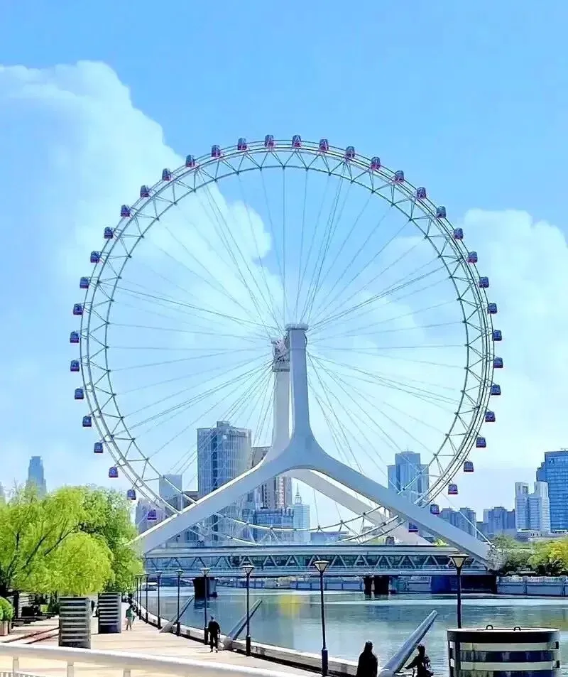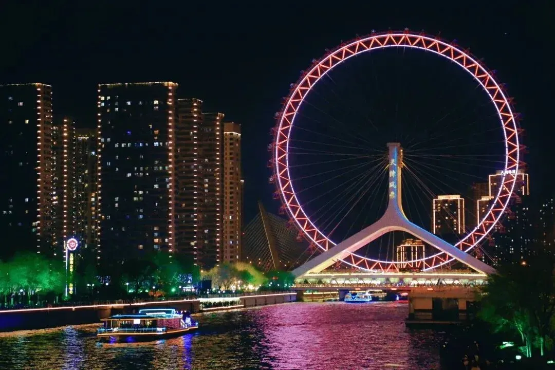 4.天津之眼:“天津之眼”摩天轮(The Tientsin Eye Ferris wheel),又称天津永乐桥摩天轮(The Yongle Bridge Tientsin Eye),位于天津市河北区李公祠大街与五马路交口的永乐桥上,跨海河连接河北区与红桥区,是一座跨河建设、桥轮合一的摩天轮,兼具观光和交通功用,是天津地标之一。