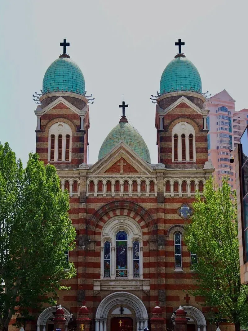 7.西开教堂:西开教堂始位于天津市和平区滨江道独山路,坐西南朝东北,全称天主教西开总堂,后因其所处地区又称为西开教堂和老西开教堂。西开教堂是民国五年(公元1916年)由法国传教士杜保禄(Paul-Marie Dumond,1864~1944)主持修建;建筑面积1891.95平方米,可同时容纳1500人,平面呈十字形。天津西开教堂建筑平面呈拉丁“十”字形构图,三个高达45米的巨型圆顶错落排列成“品”字形,三座穹窿顶均略向上拉长,表面以绿色铜板覆盖,巨型圆顶为木结构支撑,每座圆顶上有一个青铜十字架。