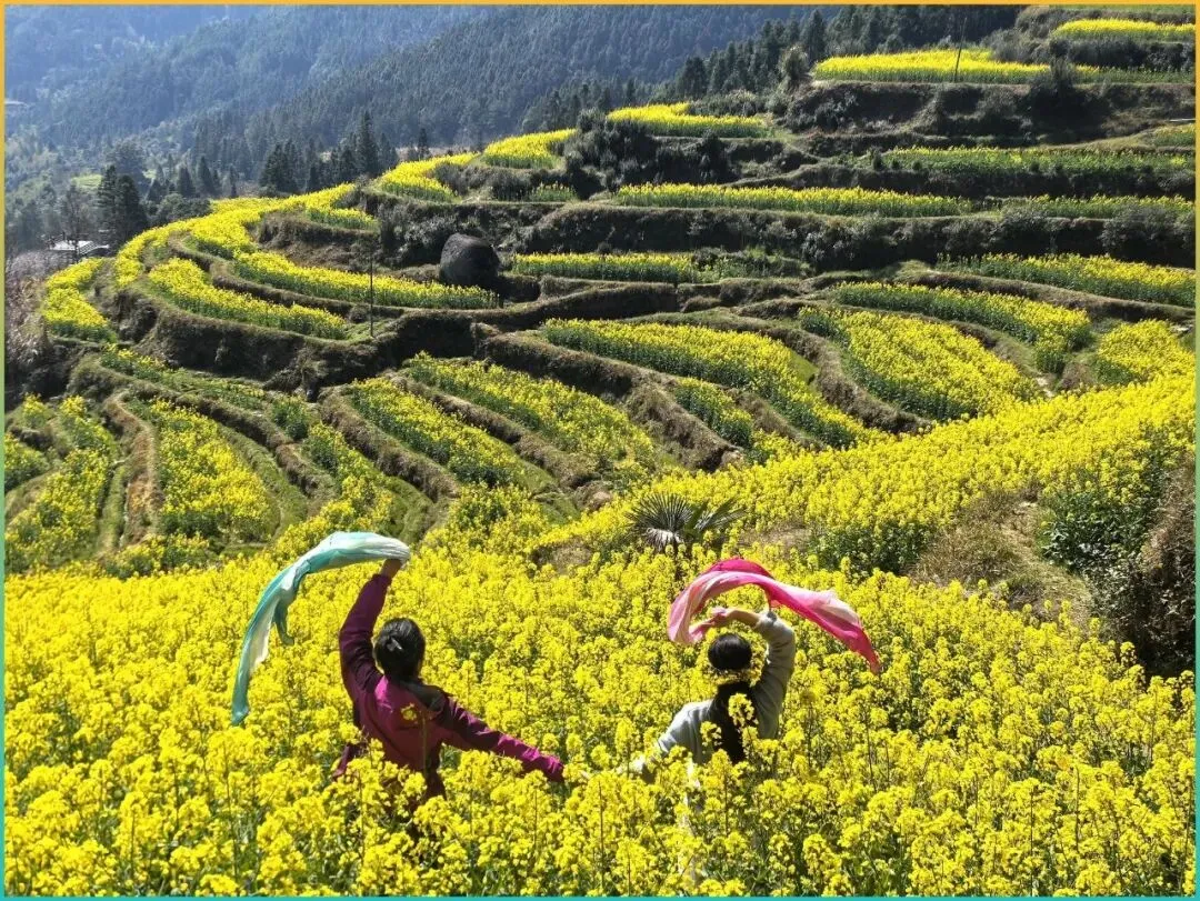 漫山遍野的金黄从脚下蔓延开去,梯田一层叠一层,白墙黛瓦的村落就那么安安静静地嵌在花海中间,远处还有薄雾慢慢升起来——老实讲,那种震撼感,照片根本拍不出十分之一。