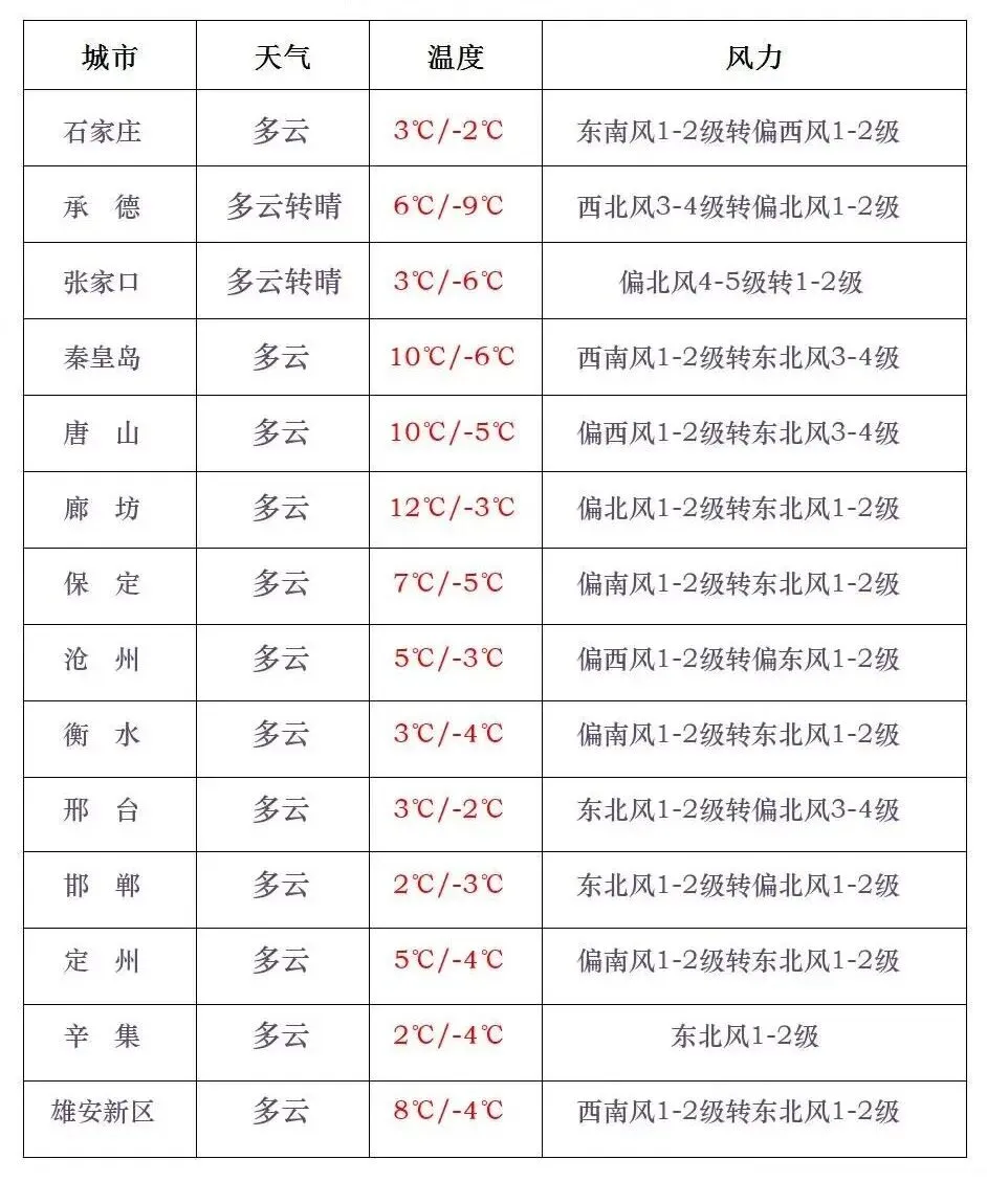 今天夜间到4日,全省多云间阴,保定、廊坊以北地区和石家庄、邢台、邯郸三个地区的西部有小雪或雨夹雪。