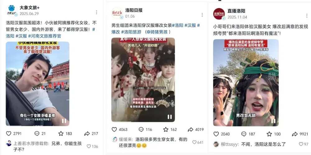 整个洛阳,穿着齐胸衫裙不少是年轻男子,而且摆各式动作的辣眼画面也在应天门、洛邑古城这些景区随处可见。这种风景,反而成了当地文旅的一道特殊风景,甚至被某些当地媒体大肆宣传和鼓吹“出奇才能制胜”(下图)。但这看似新鲜有趣的现象,背后其实藏着汉服产业发展和文化传播的诸多问题,也给汉服文化的正向推广提了个醒。