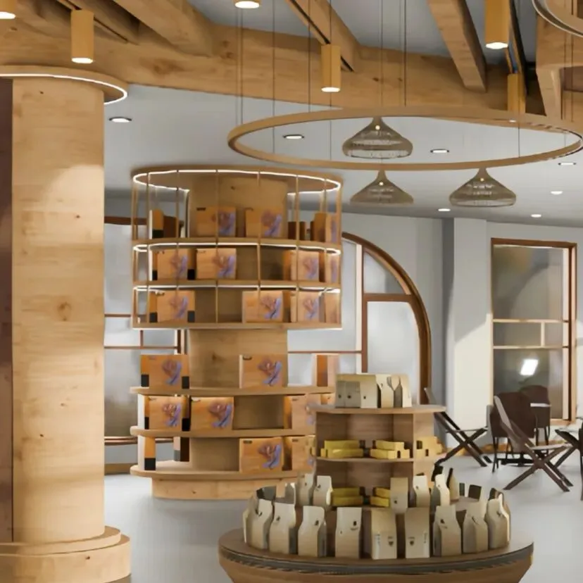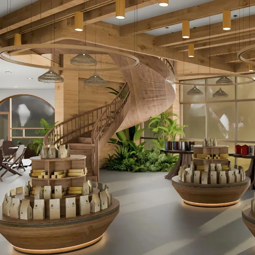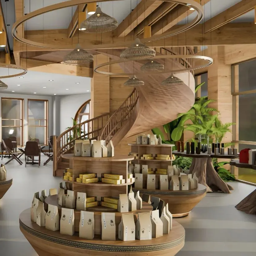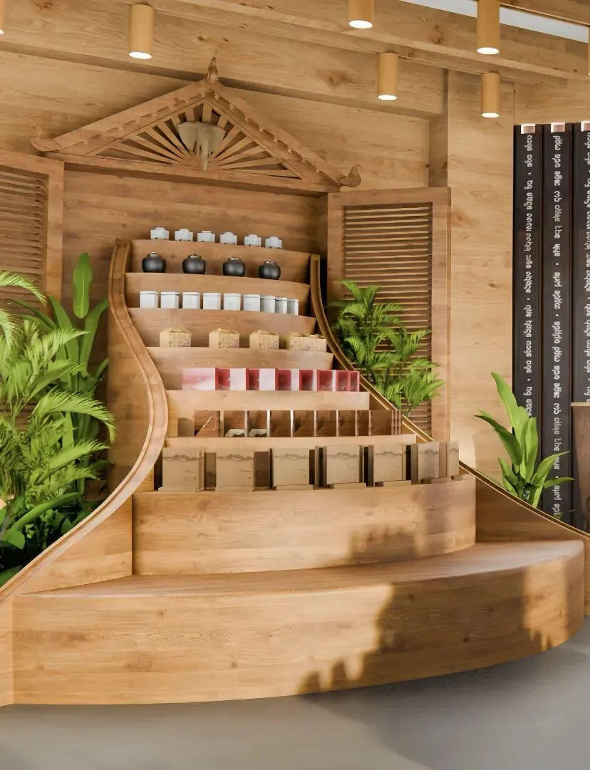 通过复刻梯田轮廓的阶梯展台、印满少数民族文字纹样的文化墙,把地域文化符号转化为空间语言,让游客在行走中感受文化脉络。高低错落的木质结构,既还原了当地梯田的地貌特征,又能让不同高度的文创产品都获得良好展示视角,茶叶、手工艺品等仿佛 “生长” 在展架上,充满在地性。
