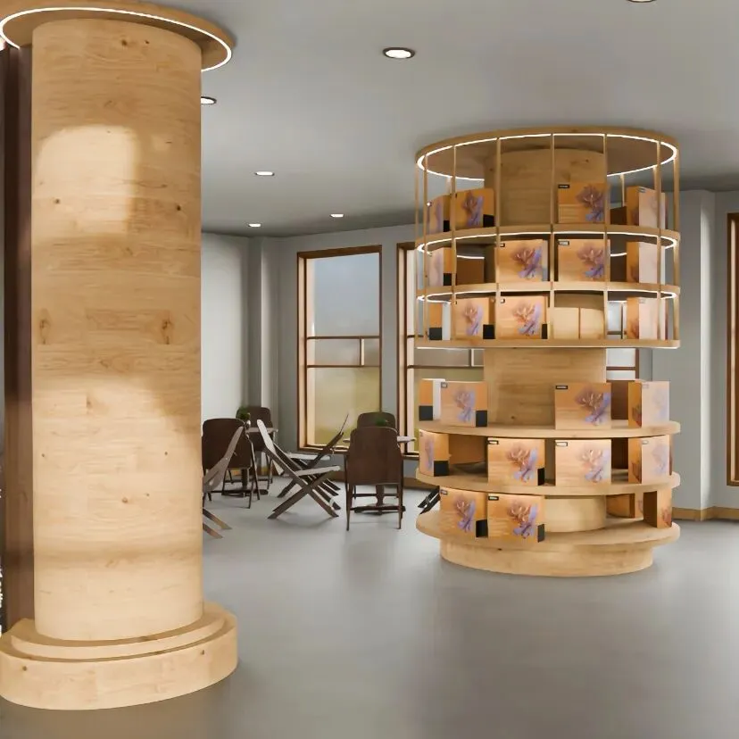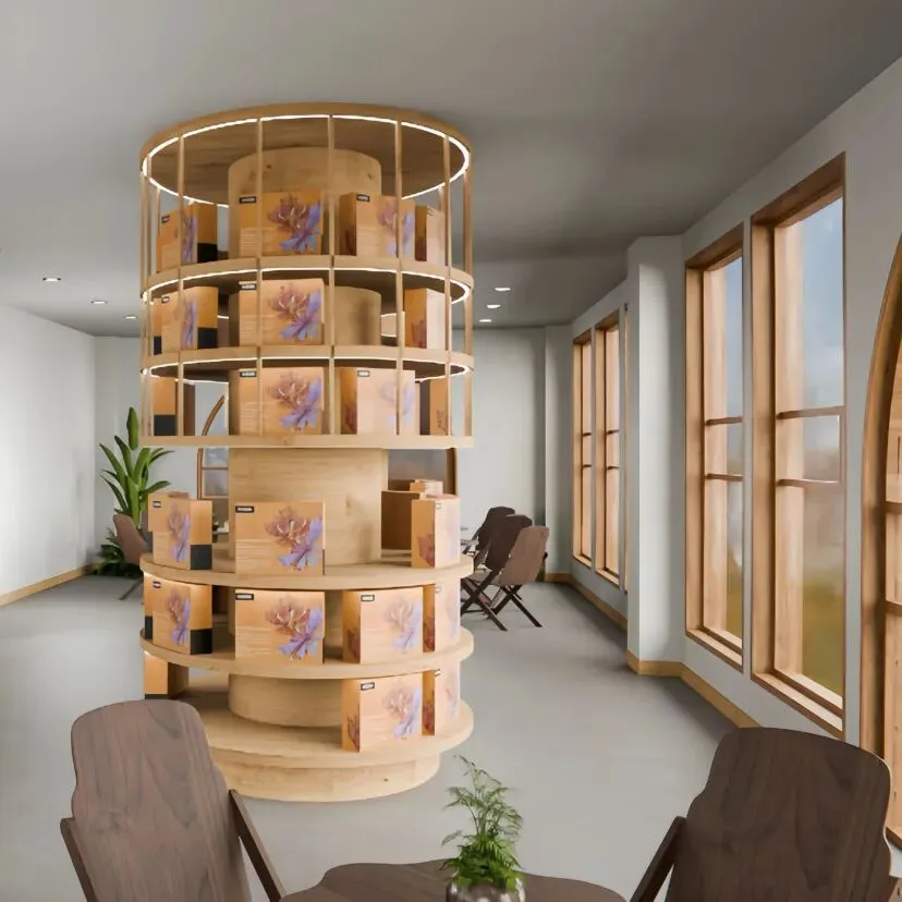 多层圆形旋转结构,最大化利用垂直空间,适合陈列丝巾、明信片等轻小型文创,游客随手转动就能发现新商品,增加了互动趣味性。