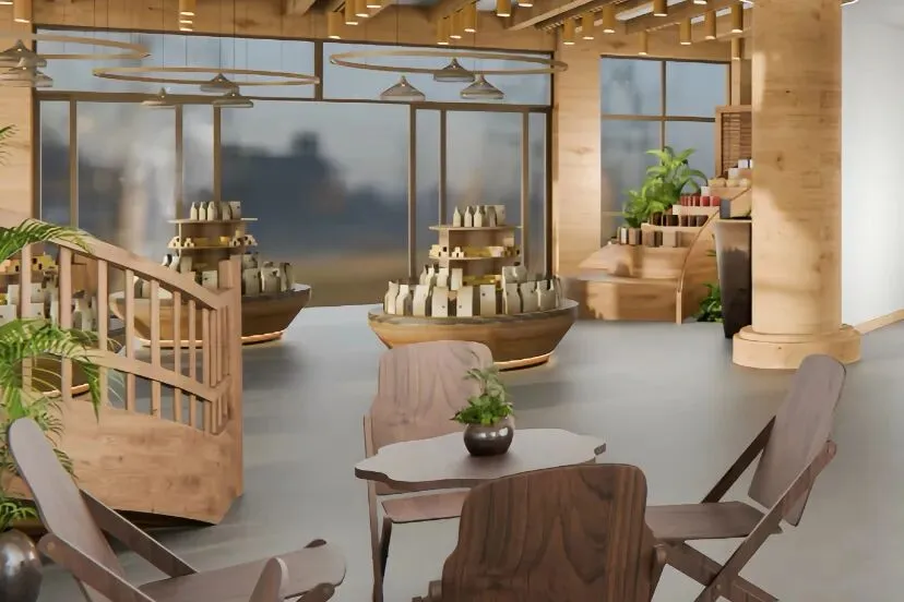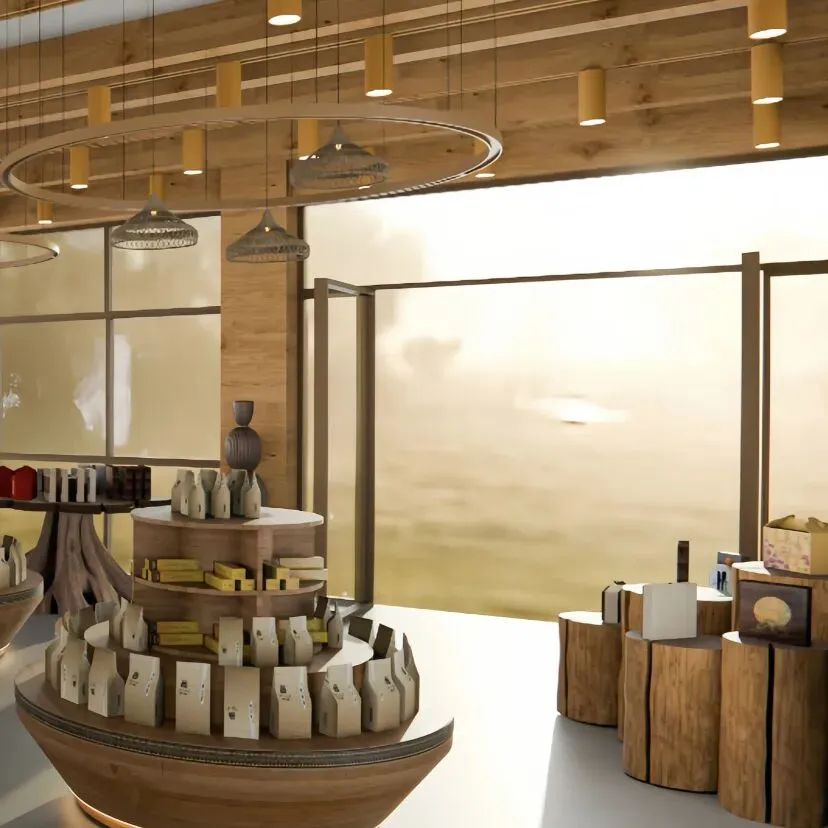 灯光以 “柔和、层次、氛围感” 为原则,用光线强化空间质感,突出文创产品。原木格栅吊顶搭配嵌入式筒灯,通过格栅过滤强光,形成斑驳的光影效果,既保证空间明亮,又避免了直射光的刺眼感,营造出林下漫步般的柔和体验。
