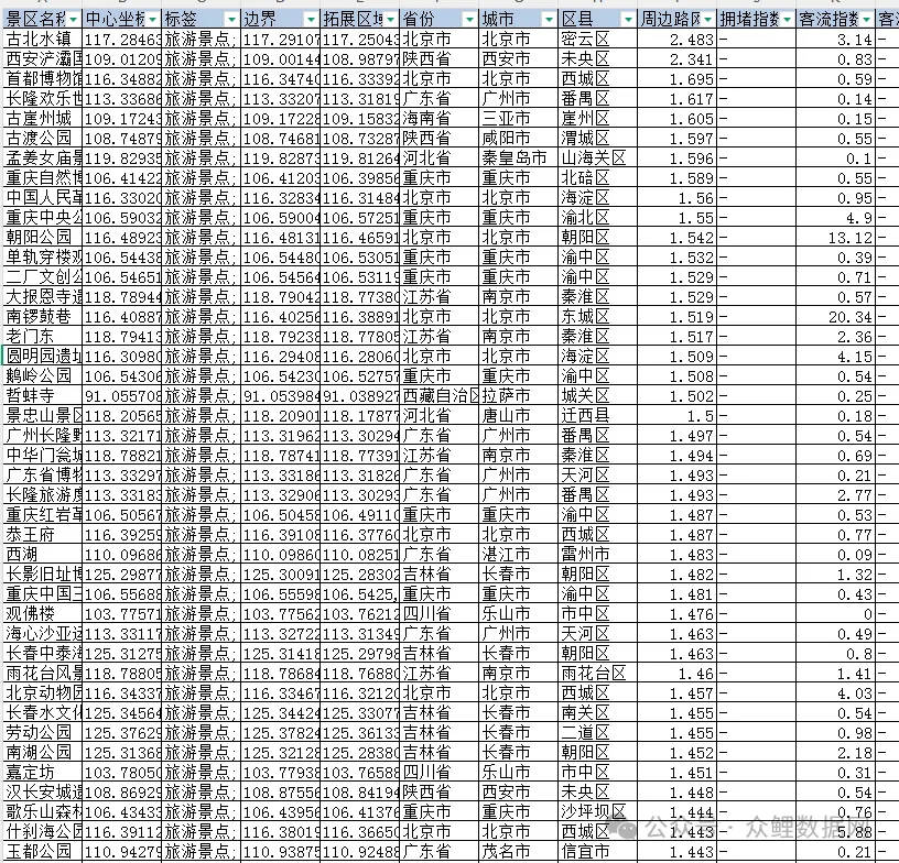 景区名称 中心坐标 标签 边界 拓展区域 省份 城市 区县 周边路网拥堵指数 拥堵指数较平日 客流指数 客流指数较平日 日期 当日排名