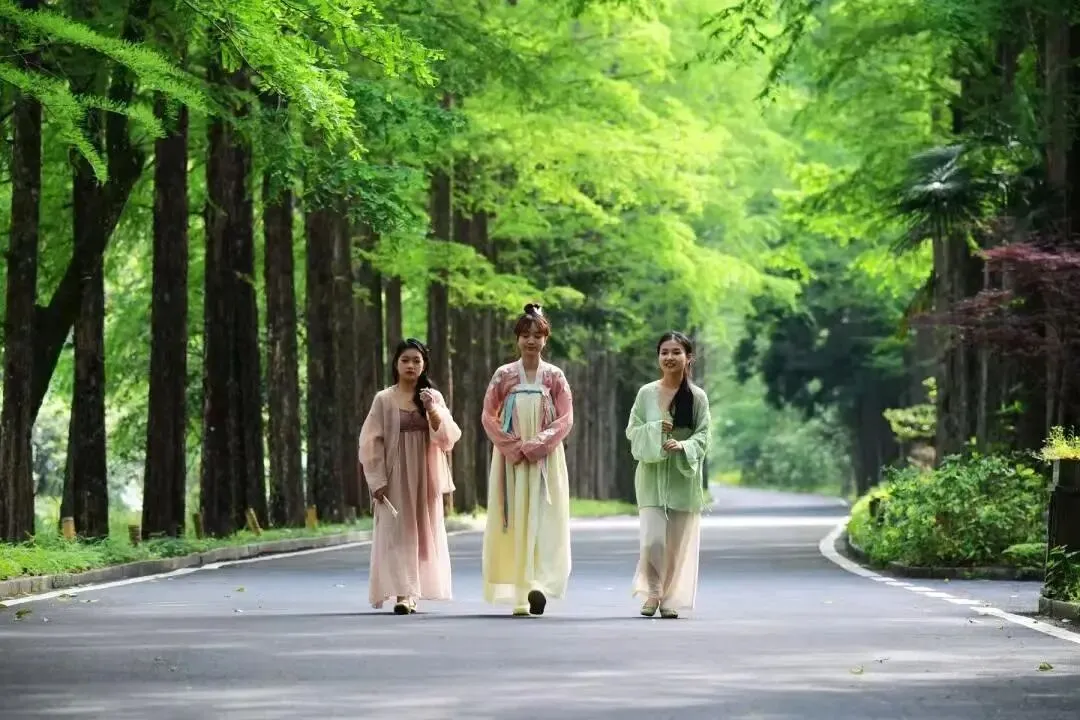 大茅山的春山,是一幅流动的青绿长卷。沿着蜿蜒的公路前行,逍遥路两旁的水杉林如卫士般挺立,阳光透过枝叶洒下斑驳的光影,仿佛走进童话世界。