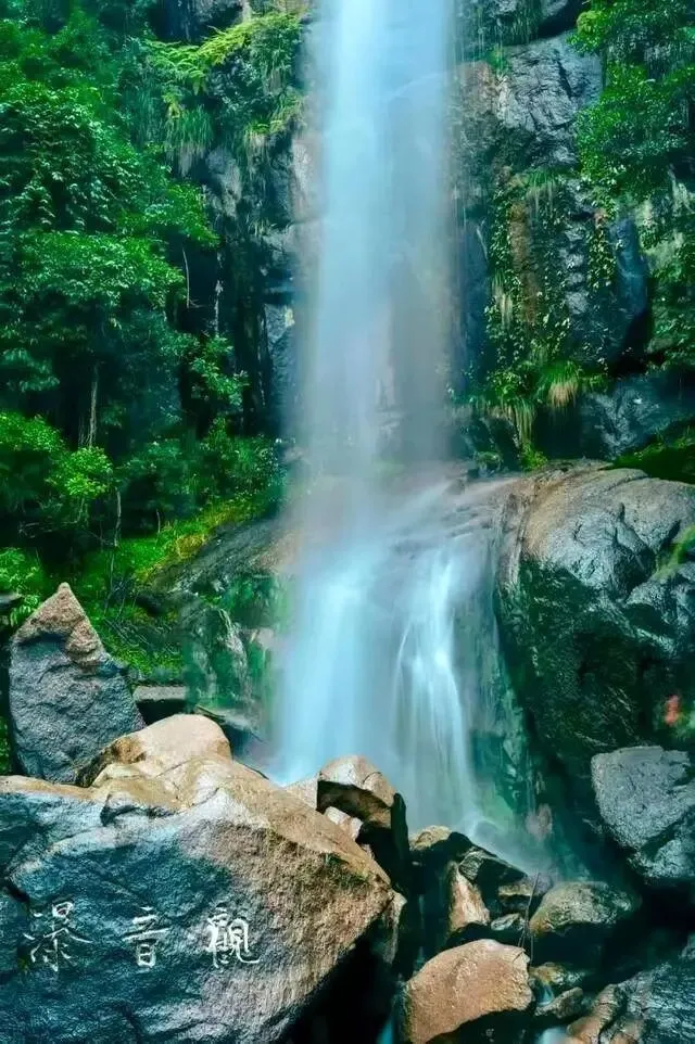 深入峡谷,溪水潺潺,仙女潭的水色如翡翠般碧绿,清澈见底;观音瀑从30米高的崖壁上飞泻而下,水幕形似手持净瓶的观音,声势磅礴,水雾扑面,带来沁人心脾的清凉。