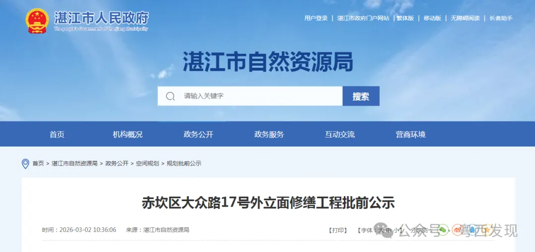 3月2日,湛江市自然资源局发布《赤坎区大众路17号外立面修缮工程批前公示》。