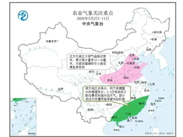 北方冬麦区密切关注苗情和墒情,科学运筹肥水,积极做好田间管理,促进小麦苗情转化升级。南方地区加强油菜、蔬菜等作物田间管理,做好蓄水备耕工作,低洼农田及时清沟降湿,适时施药一喷多防,减轻油菜菌核病等病害影响。华南早稻区适时开展早稻犁耙田和播种育秧工作,已播种的地区要加强田间管理,确保幼苗正常生长。