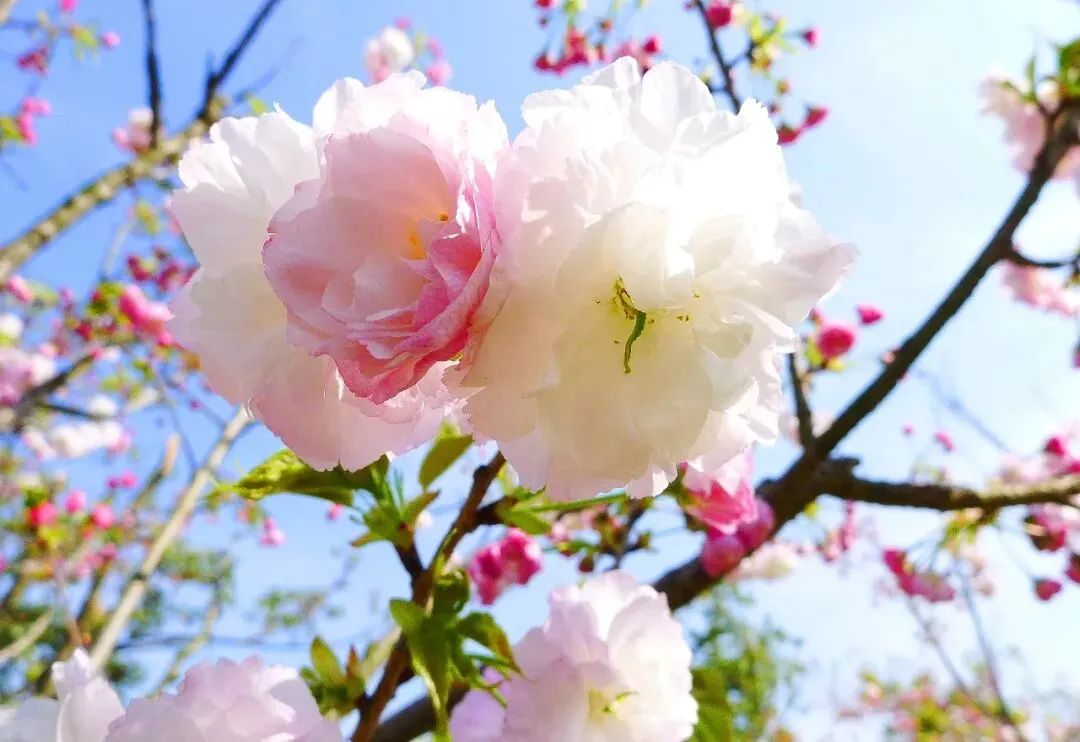 这种晚樱,是重瓣花型,花瓣是鲜艳的粉紫色,花型饱满,叶子是红褐色,花期3月到5月,花叶同生。花瓣一层一层的,花很艳丽,其时,有的已然开放,有的还是花蕾,花蕾有润肺止咳的功效,半个叶子从侧面看过去,像卧蚕。树皮灰色,伞形花序,有花2-3朵,有的达4朵之多。花瓣的颜色,有的地方是粉的,有的地方是淡紫的,像是画家提起画笔,随便这儿点点,那儿抹抹,像民间那扎染工艺印出的花布,正好应了那句诗:“浓妆淡抹总相宜”。花有斜向上的,有向下的,千姿百态,有的簇拥枝头达十几朵之多,绮丽多姿、千姿百态。