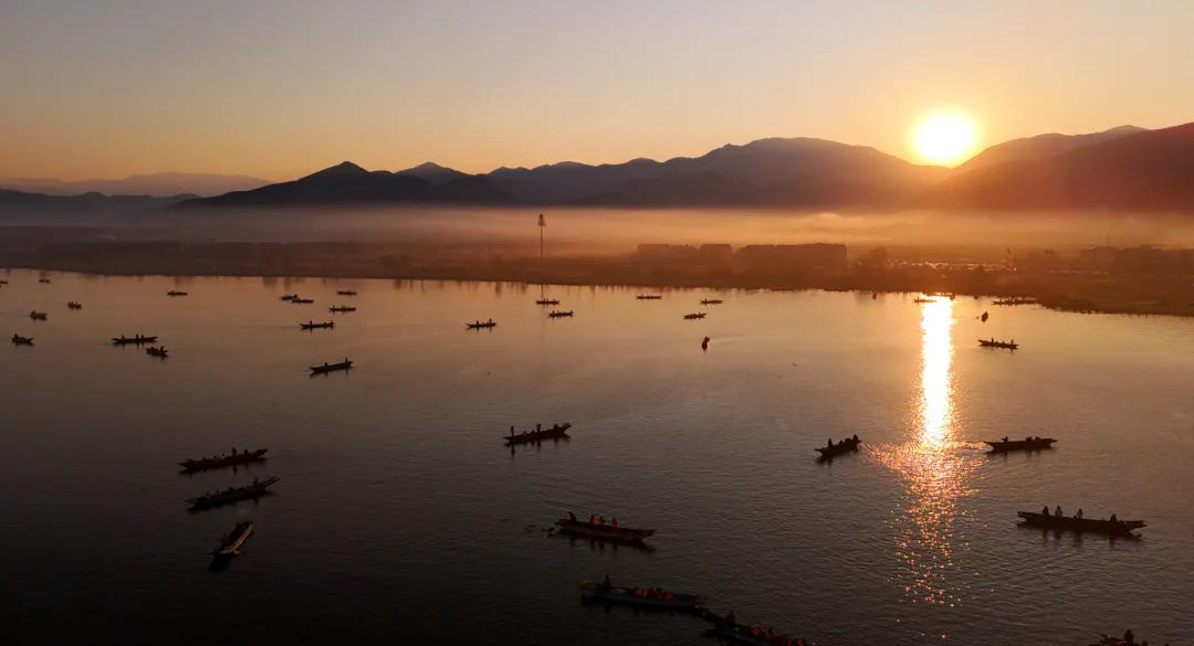 晨曦破雾,泸沽湖金光铺水,猪槽船载客迎日而行。(丽江融媒记者 李扬 摄)