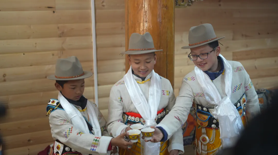 成丁礼上,来自三个家庭的三位少年以饮料代酒庆贺成长。(丽江融媒记者 李扬 摄)