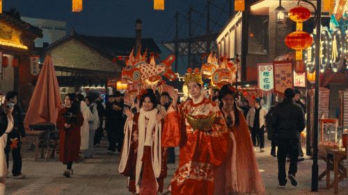 非遗鱼灯巡游队伍缓缓走来,鱼灯摇曳,光影斑驳,加入巡游,手提花灯,跟着队伍边走边唱,汇成一片欢乐的海洋。十二生肖NPC全员出动,看演出、做游戏、送粮票,兑换精美礼品。