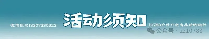 户外活动必须告知的各种潜在风险,如:扭伤、摔伤、骨折、疾病、坠崖、失温、砸伤、山体滑坡、交通事故、溺水事故、人为侵害、动植物伤害等以及其他未列入的一切风险,可能会导致身体瘫痪、甚至死亡,请根据自身的体能、经验、装备等情况参与合适自身的活动。