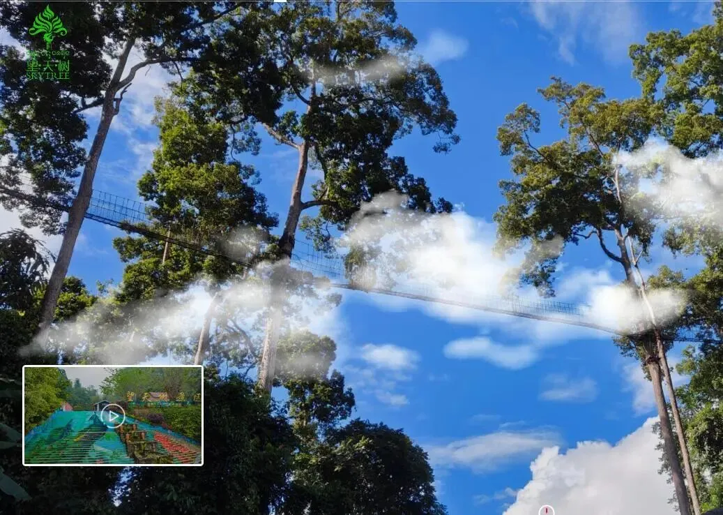 空中树冠走廊利用金属杆和绳网固定在大树上的,最高处离地有35-36米,是真悬空呀。