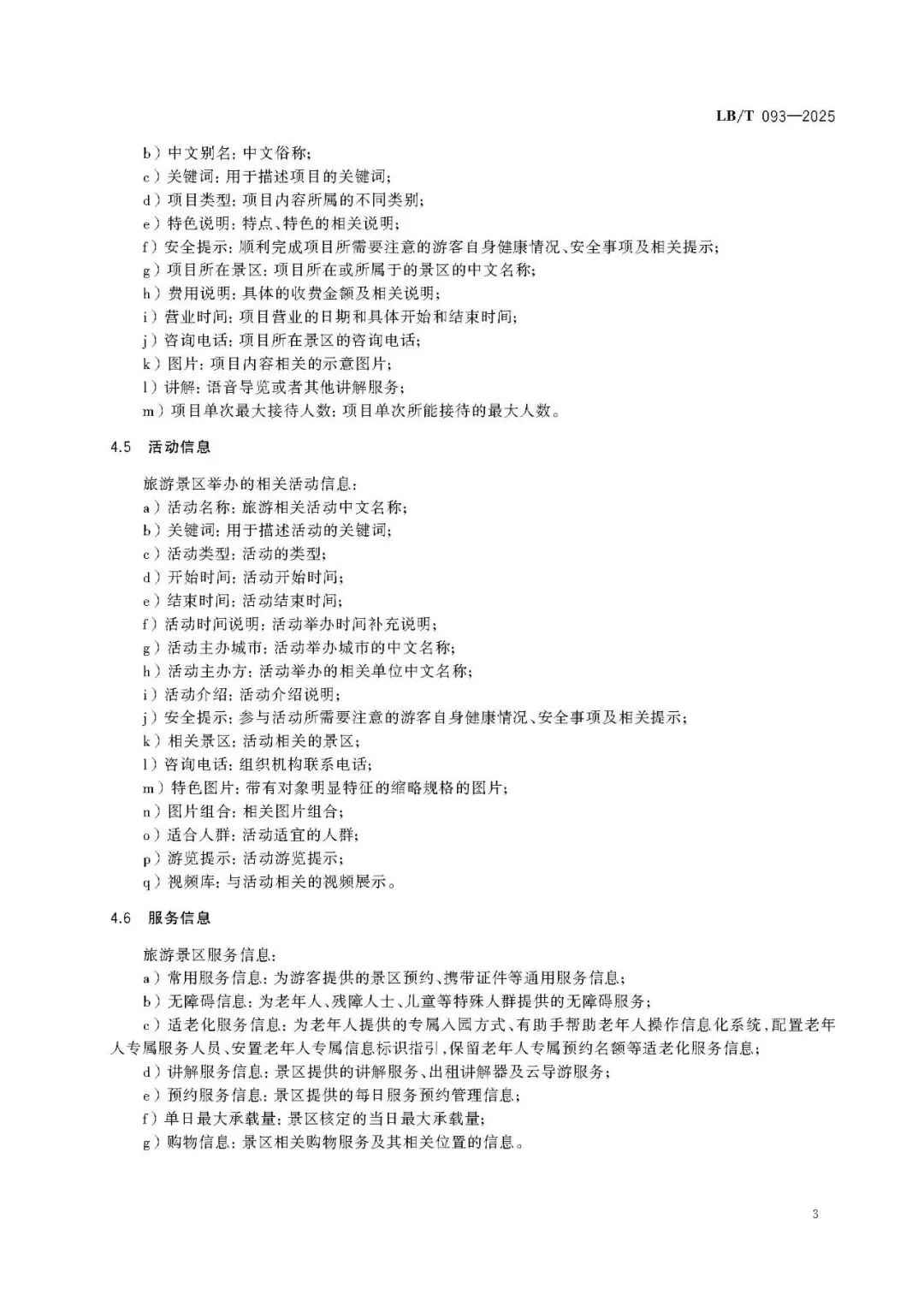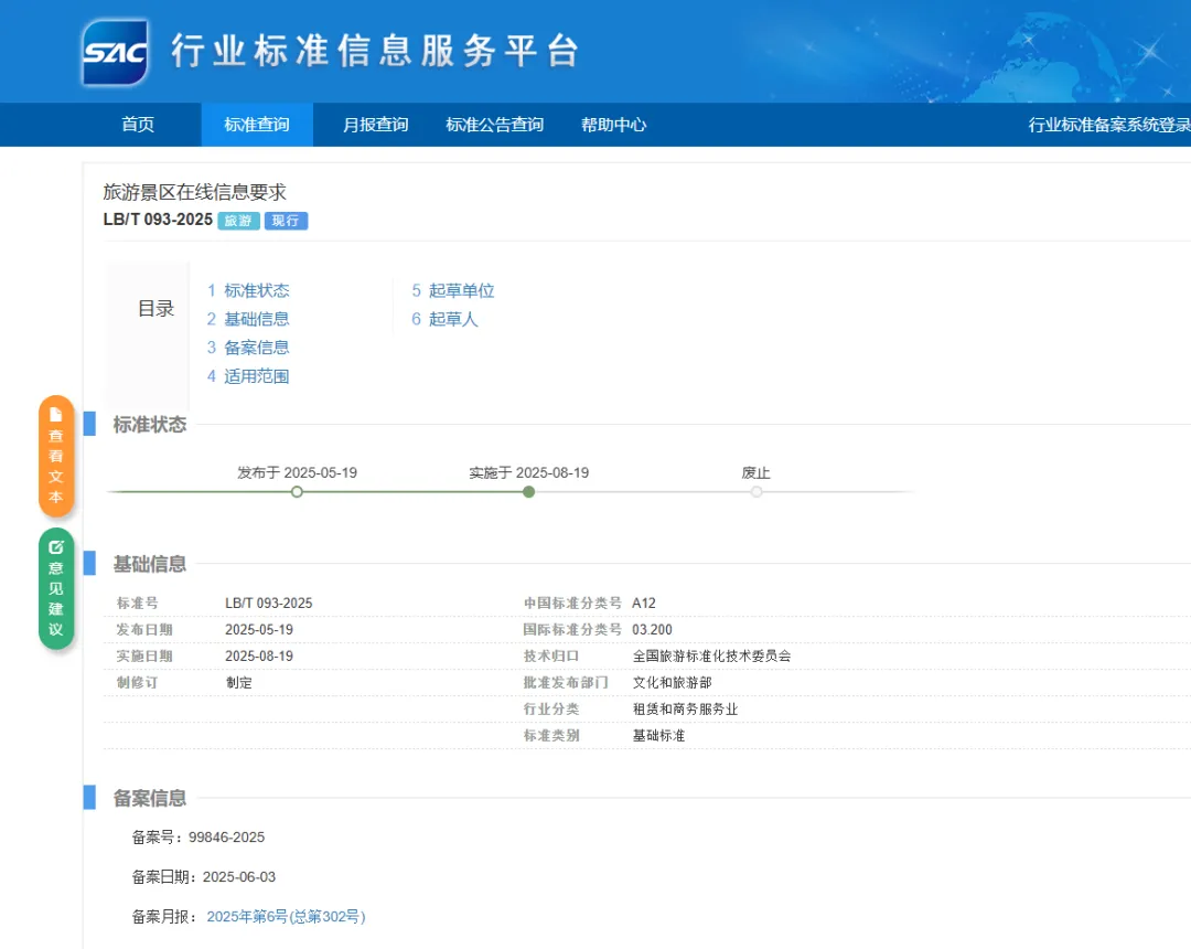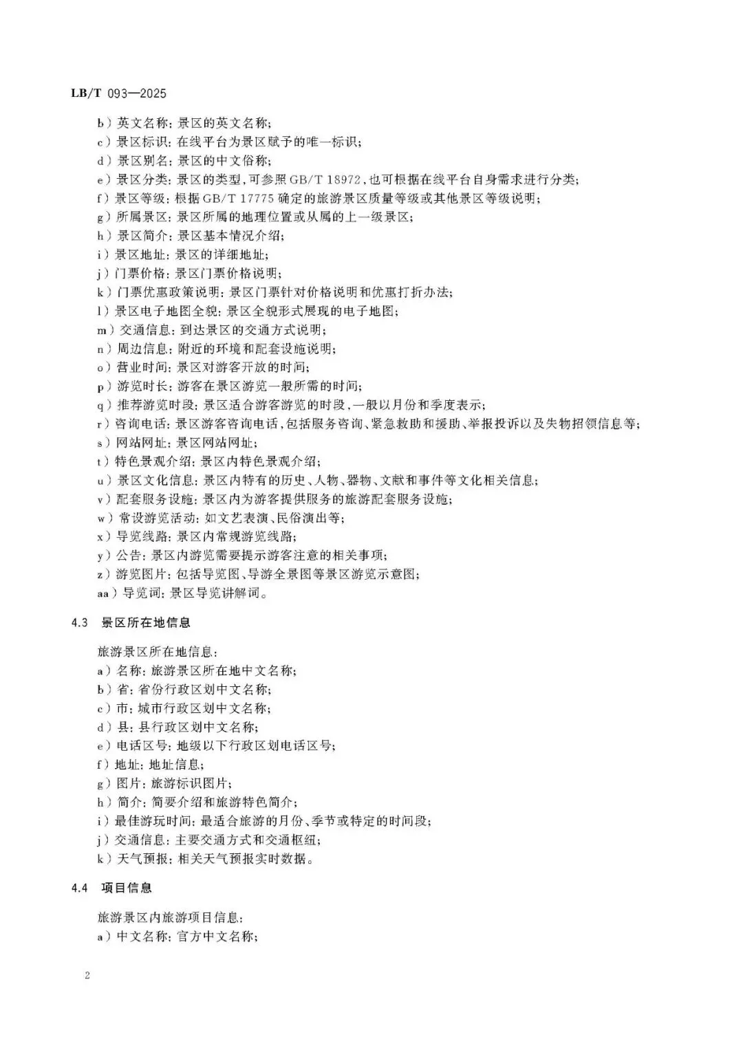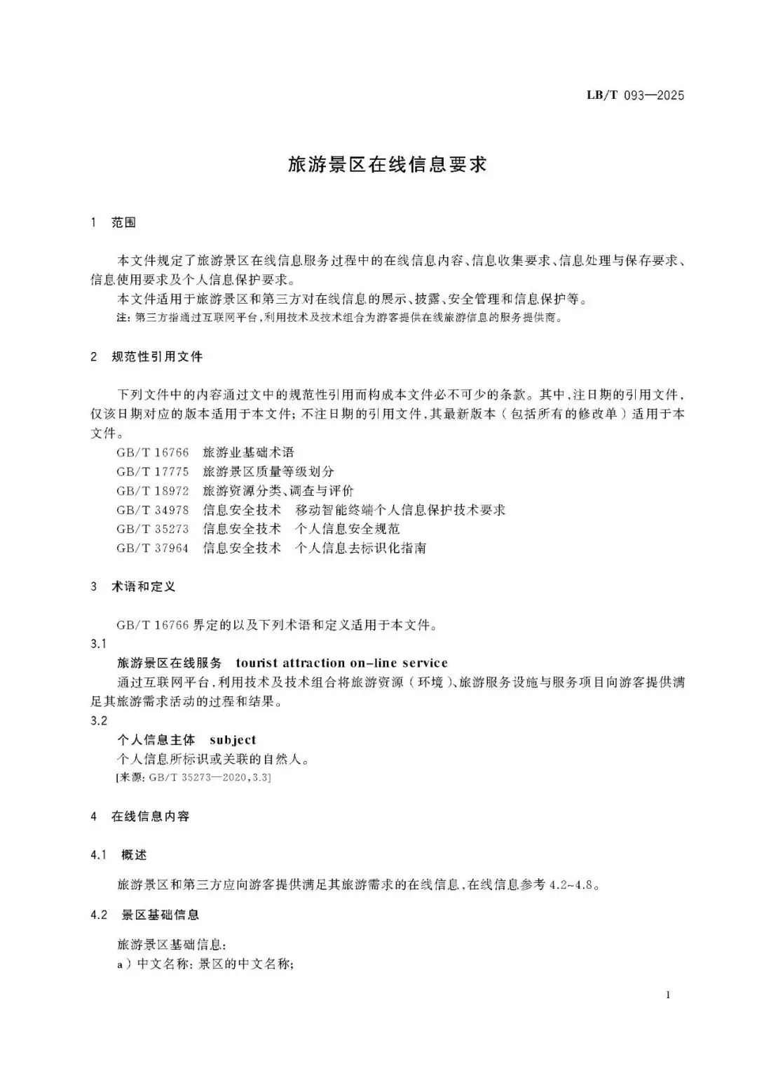 您现在的位置是:首页 > 国内旅游目的推荐 > 正文 国内旅游目的推荐 LB/T 093-2025 旅游景区在线信息要求 admin2026年03月03日 13:36:44国内旅游目的推荐1 LB/T 093-2025 旅游景区在线信息要求资料来源丨行业标准信息服务平台©版权声明:本文版权及观点属原作者所有,本平台只做交流分享,如有侵权请及时联系我们,我们将第一时间删除,转载请注明作者及原出处。 转载请说明来源于"旅荐网",部分内容转载自网络,如有侵权请联系qlwl@foxmail.com删除 本文地址:https://www.15386.cn/post/131345.html 上一篇 甘肃的这处苍茫壮阔的宝藏景点,风景秀丽,似人间仙境,堪称大西北风光的天花板!! 下一篇 北京旅游看这里!北京旅游攻略5天4晚:北京必去景点+美食地图+避坑指南(超详细版) 相关文章 丽江景点门票表 甘肃的这处苍茫壮阔的宝藏景点,风景秀丽,似人间仙境,堪称大西北风光的天花板!! 就在本周末!咸阳A级景区女性免门票! 梓潼县十大必去旅游景点,来绵阳市一日游首选这里! 抚远县十大必去旅游景点,来佳木斯市一日游首选这里! 紫金县十大必去旅游景点,来河源市一日游首选这里! 榆中县十大旅游景点,兰州市一日游精华所在,你来吗? 三月免门票|洛阳花果山景区祝您元宵节快乐! 特惠、半价、免票!上海一波景区官宣女神节专属福利 春节长假景区安全“必检清单”! 发表评论 取消回复 评论列表 这篇文章还没有收到评论,赶紧来抢沙发吧~