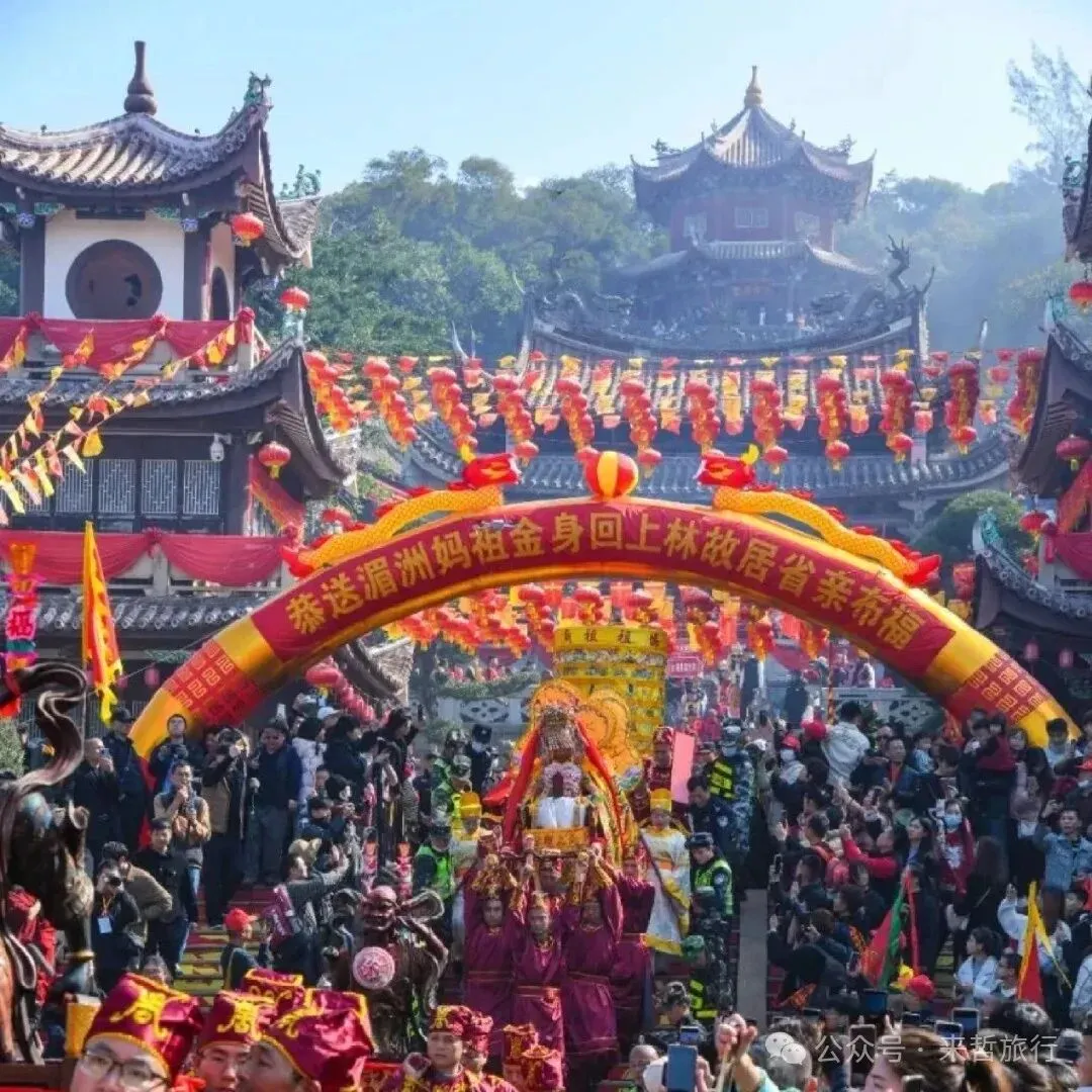内容:农历正月初八至初九,湄洲妈祖祖庙董事会举办“湄洲祖庙妈祖金身回上林故居省亲布福活动”,两岸妈祖敬仰者相聚妈祖故里欢庆元宵。活动内容包括起驾仪式、巡安布福上林故居、阵头表演、非遗体验、民俗活动、两岸同胞篝火庆元宵、金身回銮等。
