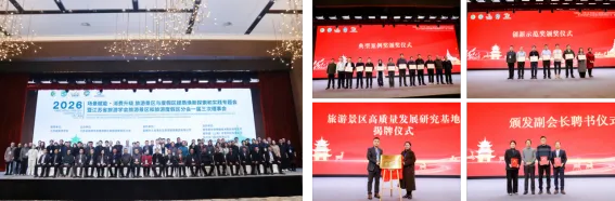本次大会还举办了颁奖、授牌活动:活动现场氛围热烈,先后举行了颁发副会长聘书仪式、颁发秘书长聘书仪式、旅游景区高质量发展研究基地揭牌仪式以及年度奖项颁发仪式,对创新示范奖、典型案例奖、优质服务奖获得者进行表彰,以此激励行业单位积极投身文旅提质焕新实践。随后,轮值会旗交接仪式庄重举行,象征着行业协作的持续深化与创新传承,为分会工作的接续推进注入新活力。