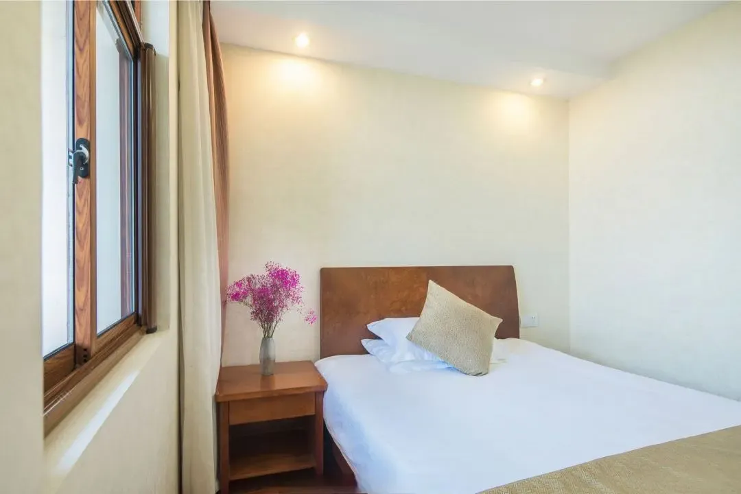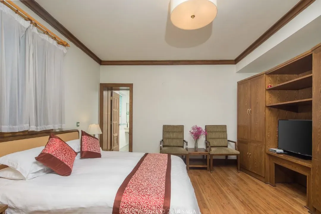 酒店整体呈回字形四合庭院结构,上下两层设计,结合中式传统美学与东南亚元素,营造出奢华静雅的氛围。院内绿树成荫,曲径通幽,兼具东方韵味与现代舒适感。