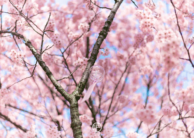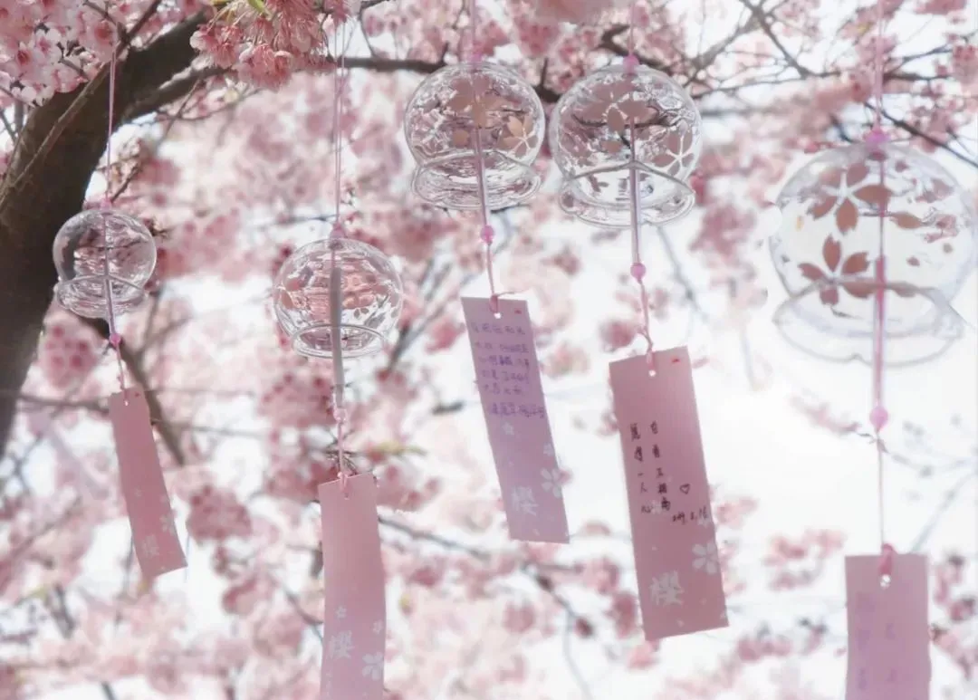 微风吹来,樱花飘落、风铃悦耳