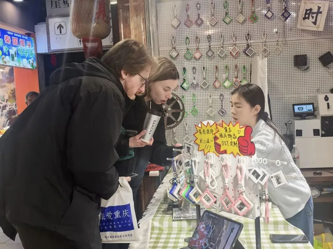 摊位前,每天都有不同肤色、说着不同语言的外国游客驻足,争相定制专属胶片挂饰,翻译软件成了我们和游客沟通的标配。来自英国的留学生,带着半个月的重庆旅行照片,一口气定制了 6 件挂饰,要把这份山城温度带回祖国送给亲友;泰国旅行团的游客们排起长队,用翻译软件认真沟通排版细节,拿到成品后纷纷举着挂饰在景区地标前打卡,直言这是本次中国之旅最珍贵的纪念。