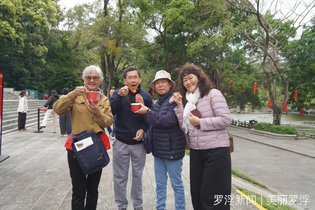 活动当天,罗浮山白莲湖畔暖意融融。景区特设的爱心摊位前人头攒动,一碗碗热气腾腾的现煮汤圆刚一出锅,便被迅速分派到每一位入园游客手中。“过了元宵才算过了年,这碗汤圆吃得心里特别热乎!”一位来自东莞的陈阿姨捧着碗,脸上洋溢着笑容。麻心甜糯、花生芝麻香气四溢,每一口都是团圆的味道。除了主角汤圆,现场还汇聚了棉花糖、糖画、糖葫芦等传统特色小吃,琳琅满目的美食不仅满足了味蕾,更唤醒了深藏心底的乡愁记忆。与此同时,景区还展出了系列文创精品与非遗项目,让游客在品味美食之余,近距离领略传统文化的独特魅力。