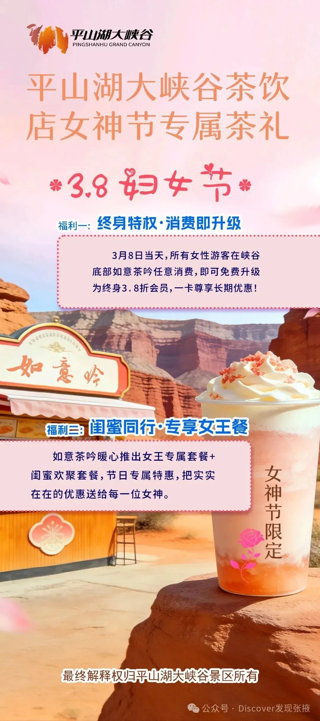 3月8日当天,所有女性游客在峡谷底部如意茶吟任意消费即可免费升级为终身3.8折会员!一张会员卡,尊享长期专属折扣往后每次来峡谷,都能享受超值优惠,宠你不止一天~