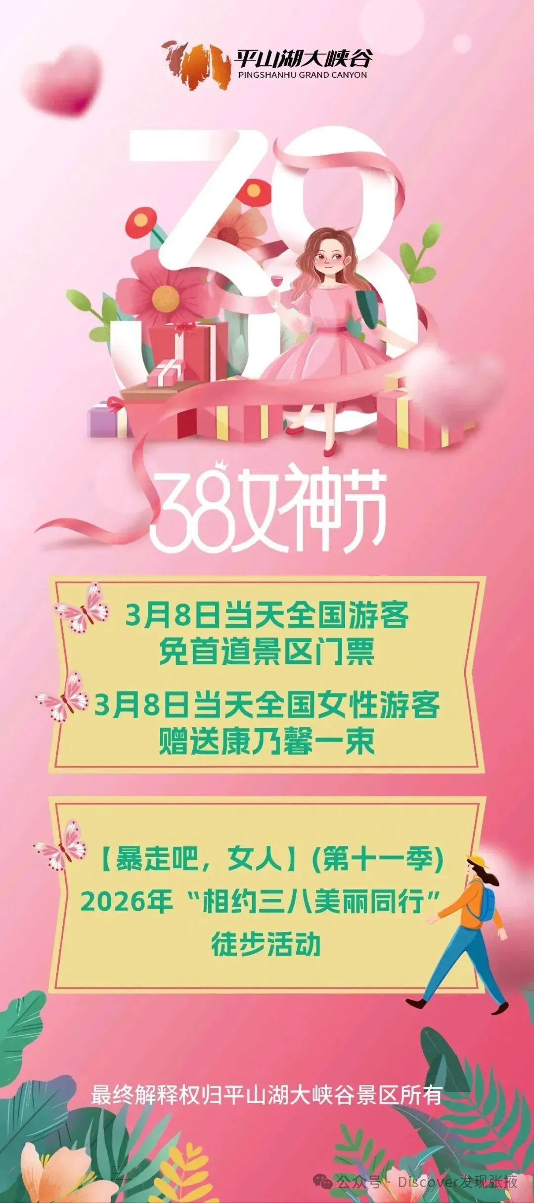 风送暖,芳华绽放在专属女性的美好节日里平山湖大峡谷以春光为礼,以美景为伴精心筹备五大女神专享主题活动还有超燃的「暴走吧,女人」徒步活动同步开启3 月 8 日,邀各位女神奔赴峡谷解锁春日限定美好,尽享专属宠爱~
