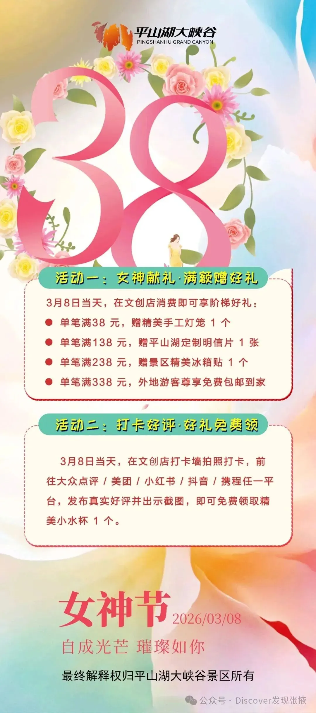 春风十里,不如宠你3月8日,平山湖大峡谷以最美的春光、最丰厚的福利迎接每一位女神的到来愿你在峡谷间,邂逅美好,绽放芳华不负春日,不负自己~