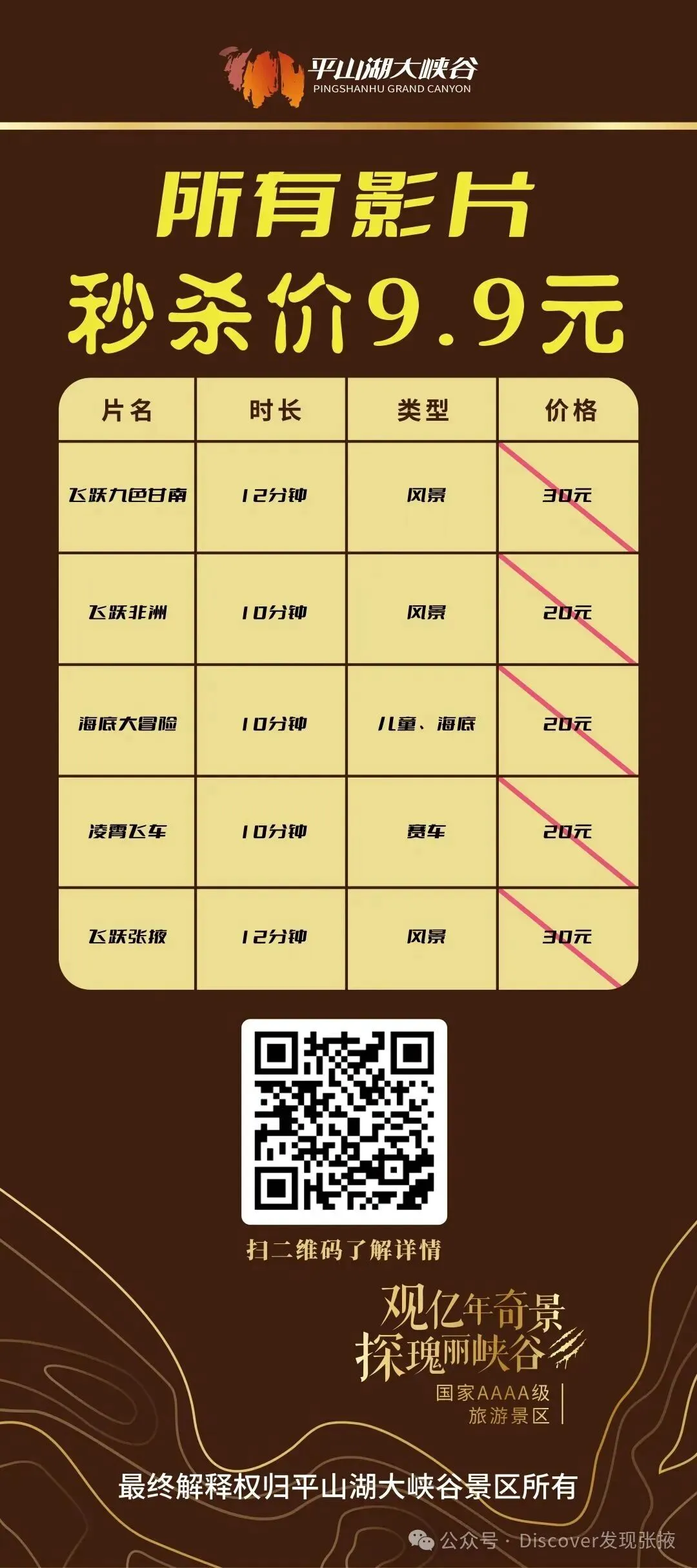 沉浸式体验峡谷震撼,视觉盛宴免费享!3月8日当天,球幕影院所有影片女性免费观看同行其他游客还可享9.9元秒杀观影福利超震撼的视听效果,沉浸式感受平山湖大峡谷的壮美风光这场视觉盛宴,邀你免费赴约~