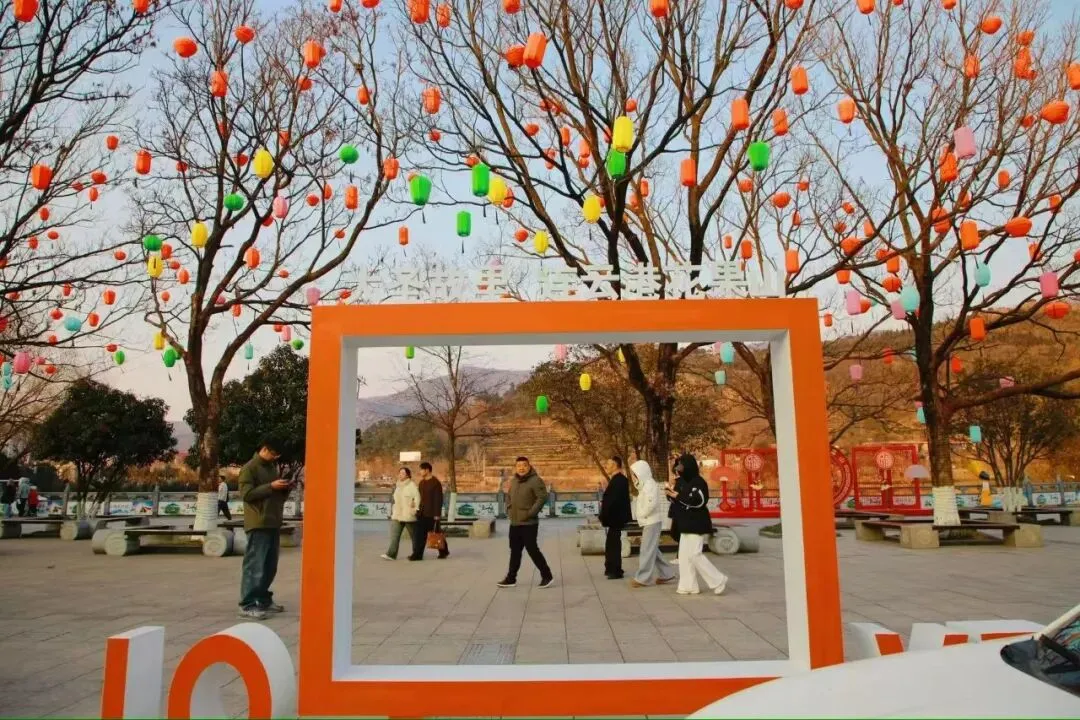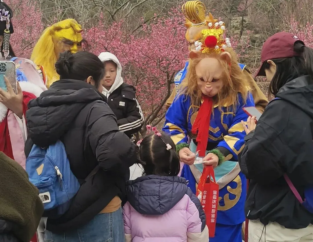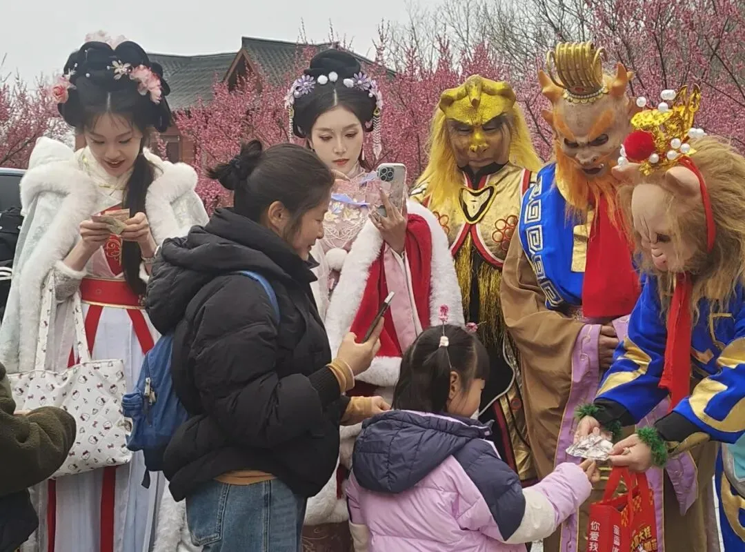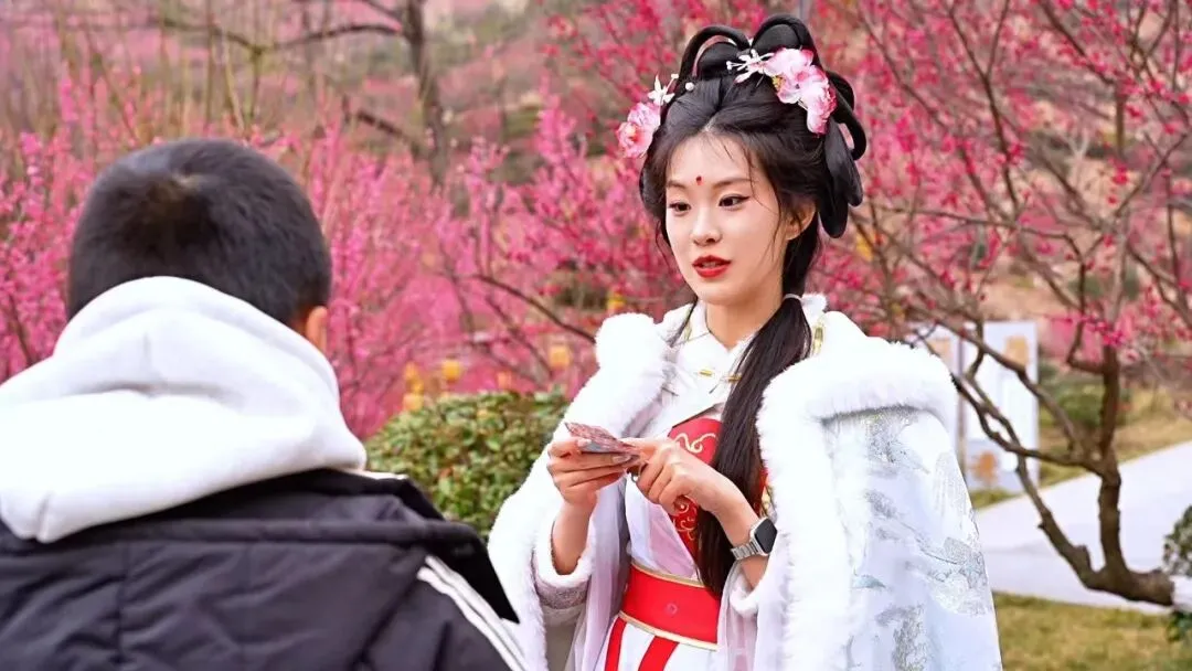 为了给游客带来更丰富的元宵节日体验,景区特别组织西游NPC走进梅园,与游客互动猜灯谜。暗香浮动的梅花树下,游客们徜徉在花海之间,或凝神思索,或会心一笑,猜中谜底的幸运儿还能接过精美的花果山特色文创,将一份来自仙山的祝福带回家。梅香、灯谜、笑语,交织成一幅动静相宜的节日画卷,让这个元宵在花果山上“闹”出了几分诗意与温情。