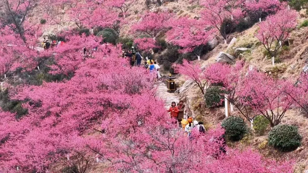 若论元宵何处最“红火”,当属花果山景区梅园。元宵佳节期间,2万余株梅花次第绽放,层层叠叠,灿若云霞。花朵在阳光下娇艳欲滴,与远处的青山、近处的古建筑相映成趣。