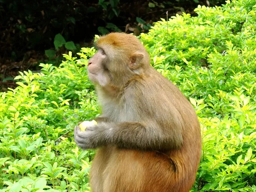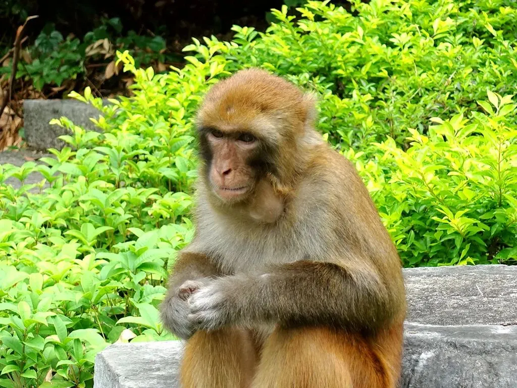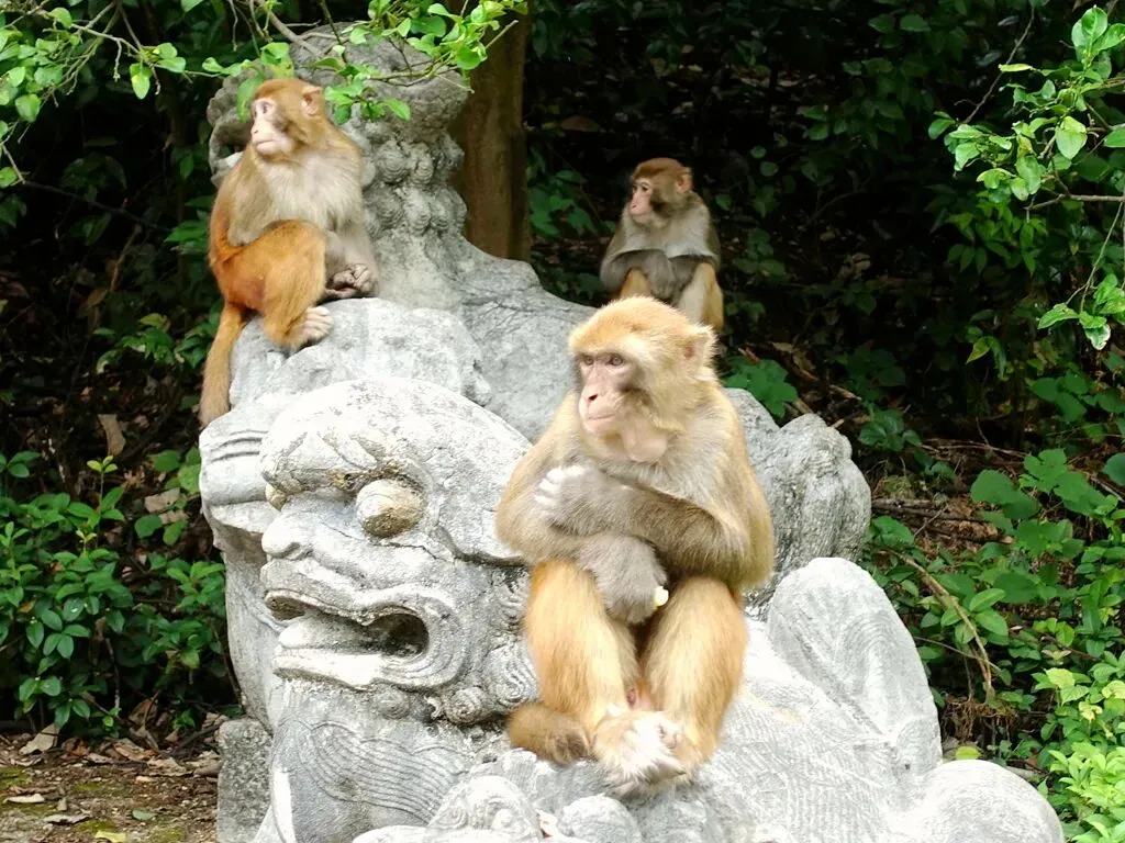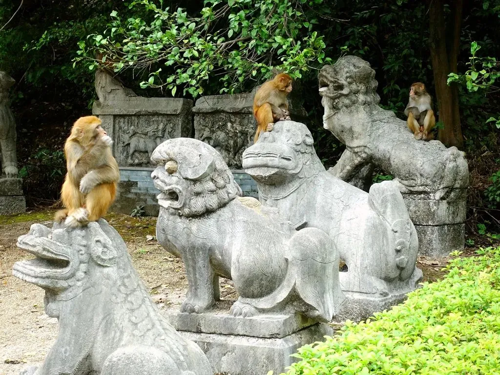 正当我遐想之际,树枝突然抖动了起来,一只可爱的金毛猴子,从树上跳下来蹲在石墩子上面,幸好进门的适合买了喂猴子的花生,赶紧丢过去给它尝尝,结果引来树林里的猴群,它们或挂在树枝上摇荡,或蹲坐在石头狮子的头上背上,引来附近游客围观和拍照,它们很呆萌很可爱,这也是游览中的意外惊喜。继续往前走就到了标志性景点骆驼山,真的非常像头骆驼,随后从驼峰大门离开,返回酒店吃饭午睡。