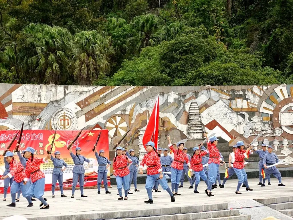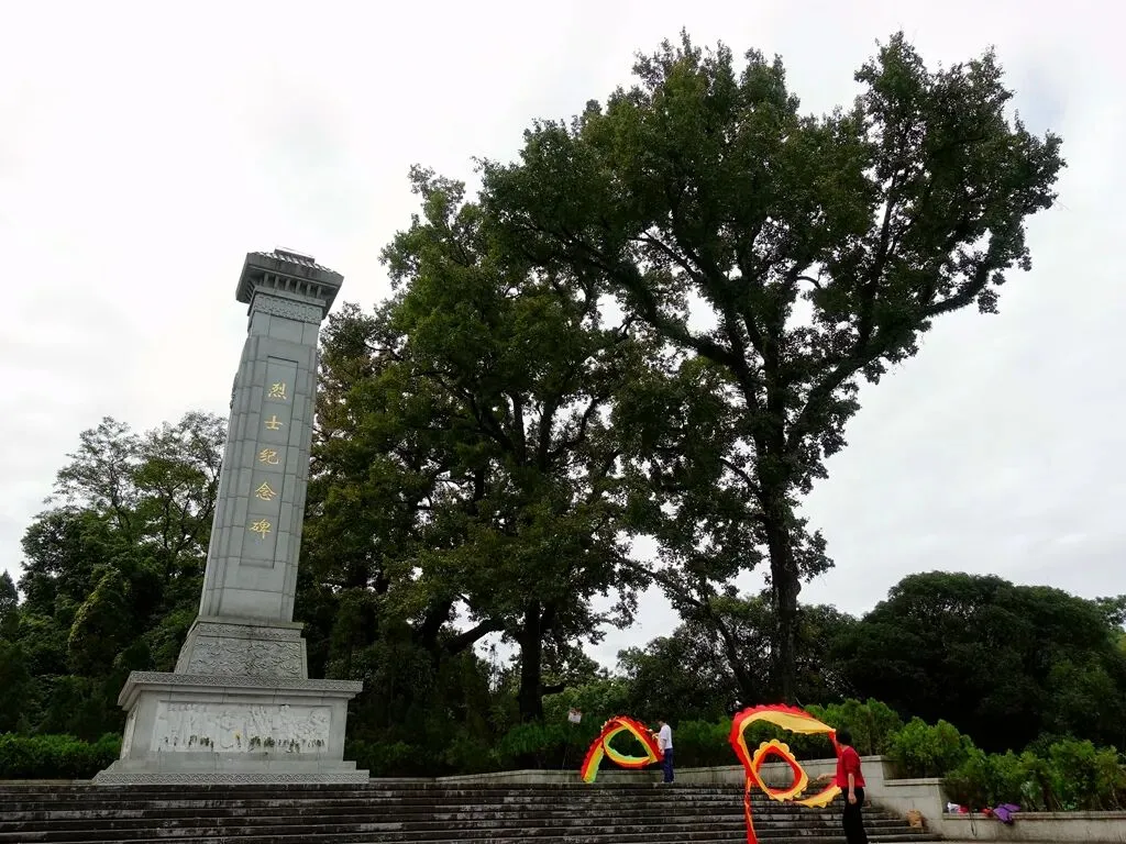 从栖霞大门进入七星景区,映入眼帘的就是始建于唐代的栖霞古寺,栖霞禅寺,历经沧桑,几度重建,是桂林古名寺。匾额为原中国佛教协会会长赵朴初先生手迹,寺庙设天王殿、大雄宝殿、观音殿、藏经阁和钟鼓楼等。人们在英雄纪念碑下散步和运动,广场上正在举办纪念抗日战争80周年的文艺演出。